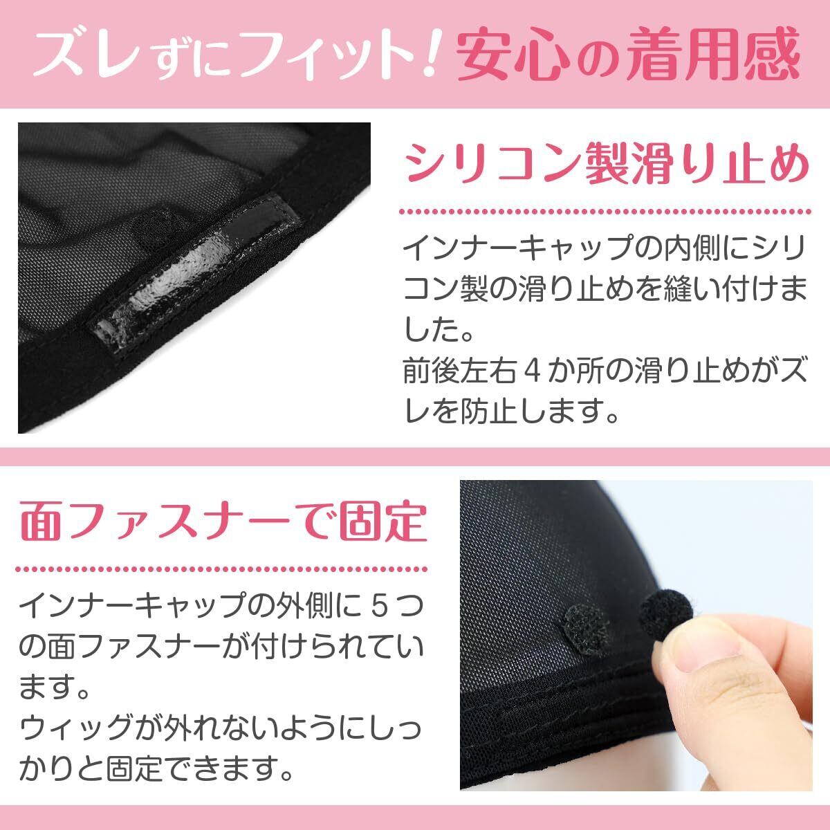 【ズレにくさを追求】インナーキャップの内側には前後左右にシリコン製の滑り止めが付けられています。ピタと密着してくれますので外れる心配がありません。また、外側には5か所に面ファスナーが縫い付けられております。面ファスナーの覆い外してからウィッグを被ると、一日中動き回ってもズレません。