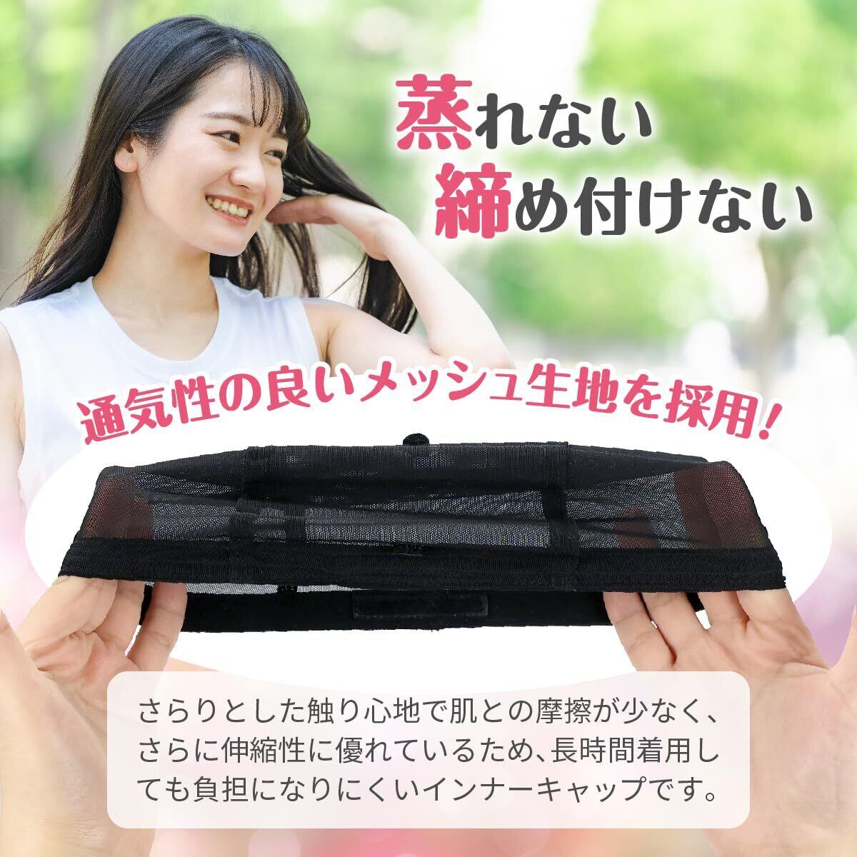 【クオリティ】長時間着用していても負担にならないインナーキャップです。通気性に優れたメッシュ素材で作られており、夏場でもムレずに快適にお過ごしいただけます。さらっとした触り心地の良い生地ですので肌との摩擦も少なく、伸縮性も抜群ですので締め付け感も不快感もありません。