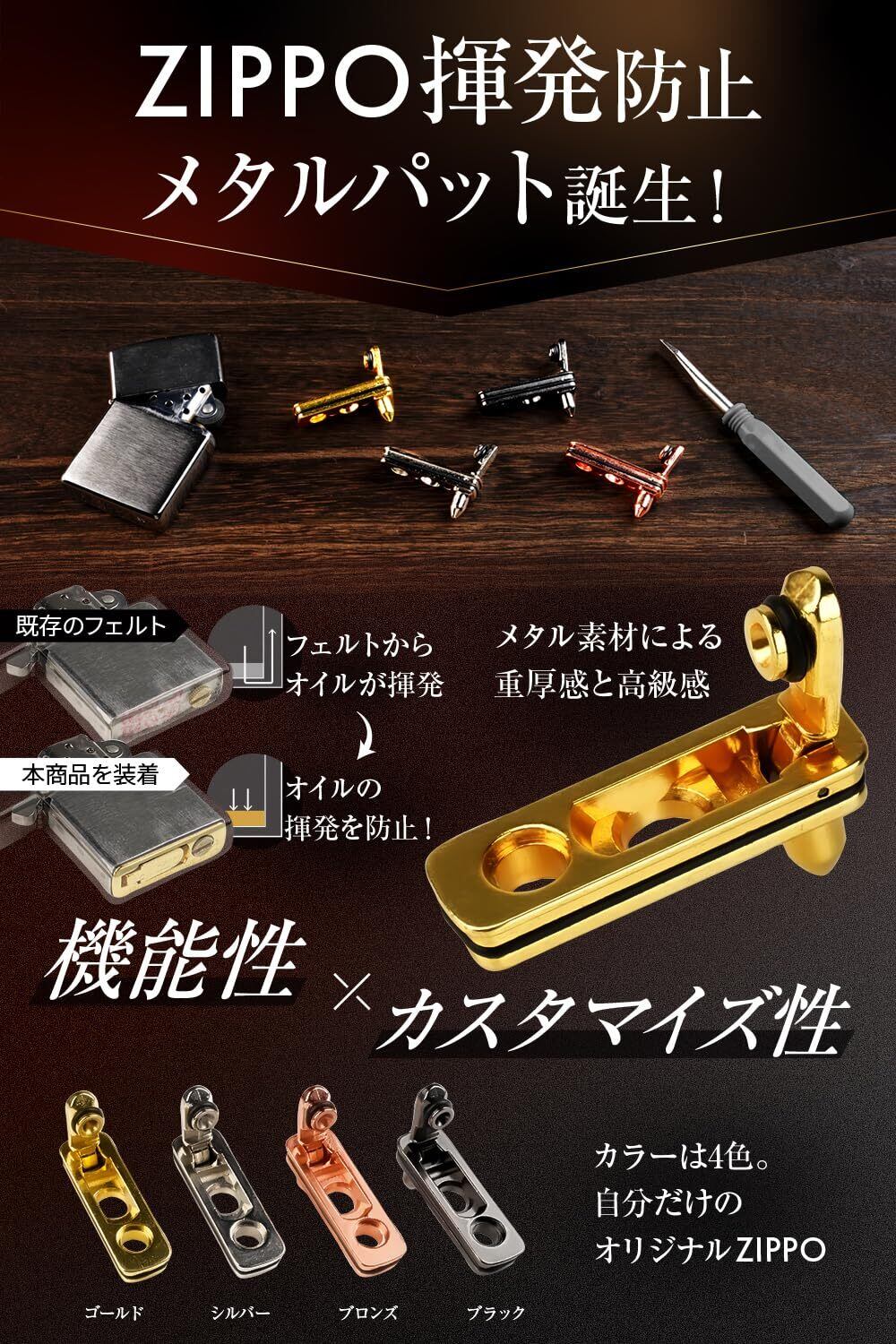 【選べる4色で愛着アップ】ZIPPOの雰囲気を損なわず、ブラック・シルバー・ゴールド・ブロンズの4色から選べるメタルパッド。機能性だけでなくジッポ カスタムパーツとしても人気で、ジッポ 揮発防止と見た目の両立を叶えます。