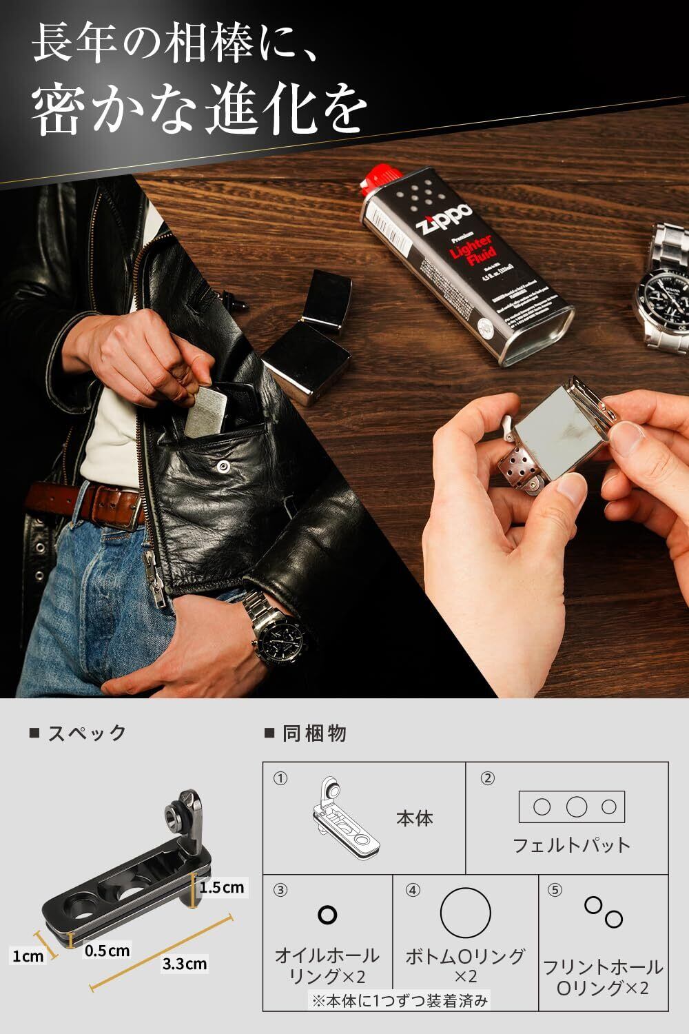 【密かなカスタムが光る】ZIPPOの内部に装着するだけで、見た目は変えず、実用性とこだわりを両立できるジッポ カスタムパーツです。ジッポ オイル揮発防止対策として、愛用のZIPPOにさりげない進化を。zippo 揮発防止としても高評価。