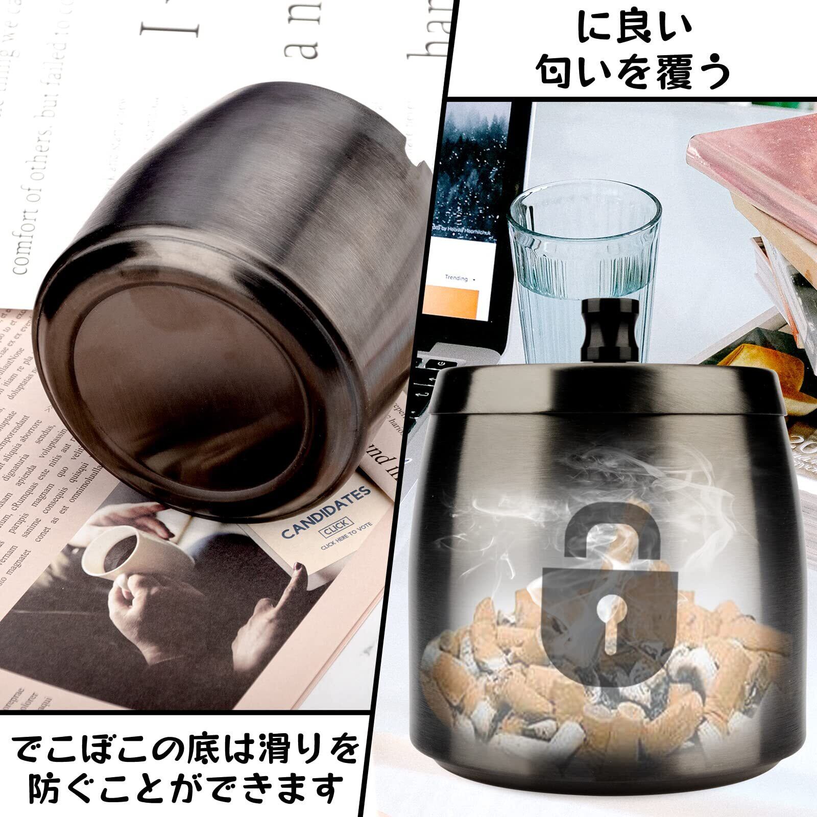 蓋付きステンレス鋼灰皿-滑り止めベース灰皿、ポータブル灰皿、屋内および屋外での使用に適しています、Black、L