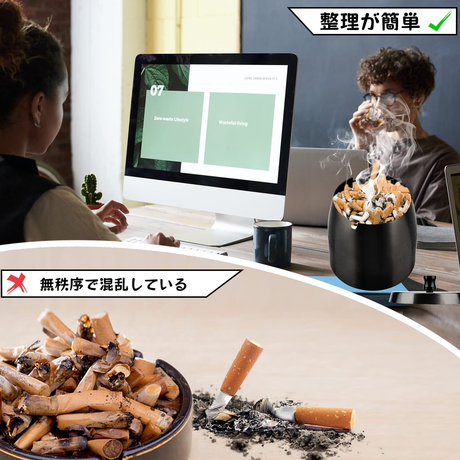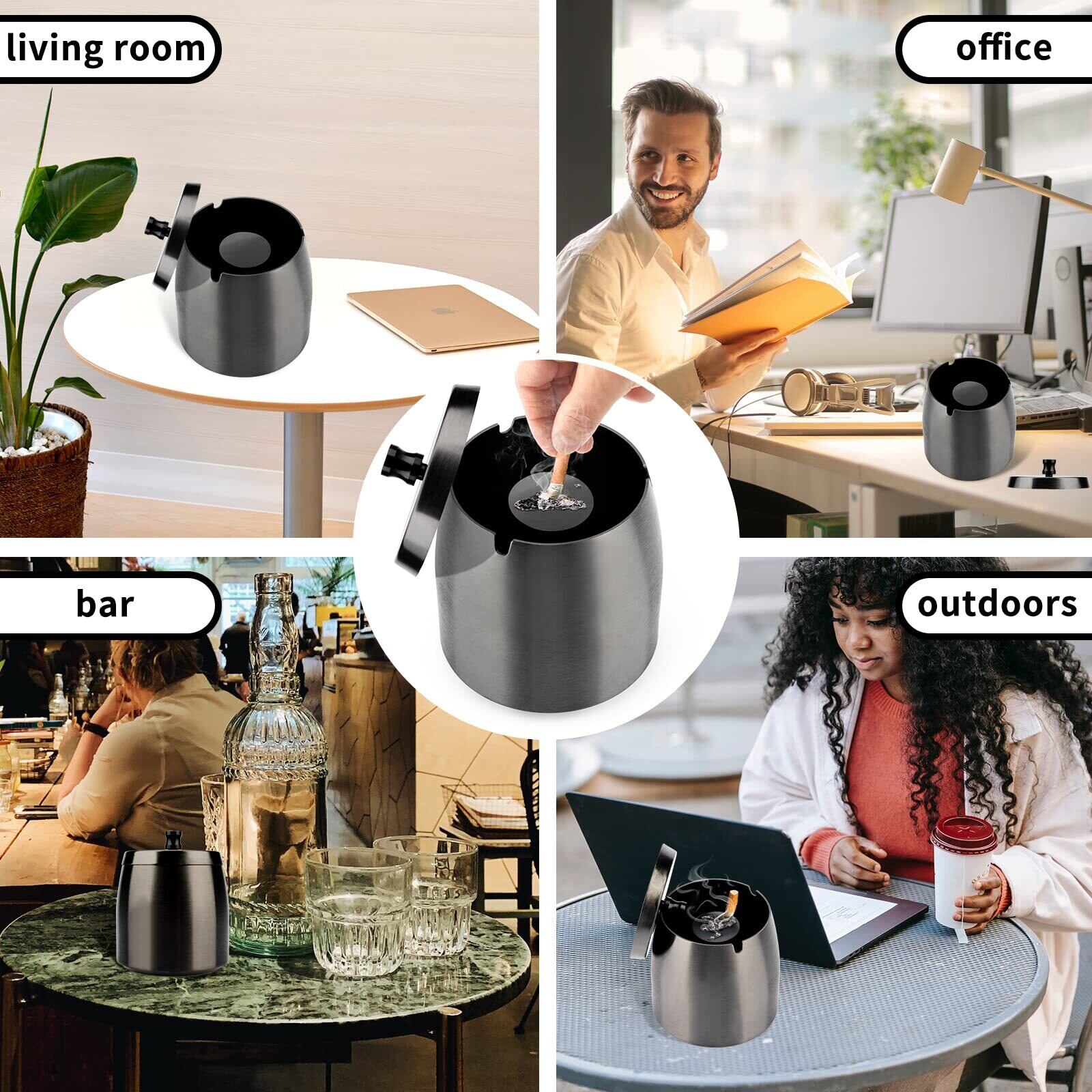 【高品質の固体ステンレス鋼】灰皿は非常に強く、厚いステンレス鋼でできています。大容量で、煙や灰が風で吹き出すのを防ぐことができ、独自のカバーが付いています。使用しない場合は、カバーを覆って臭いや煙の拡散を防ぎ、非喫煙者の世話もできます。