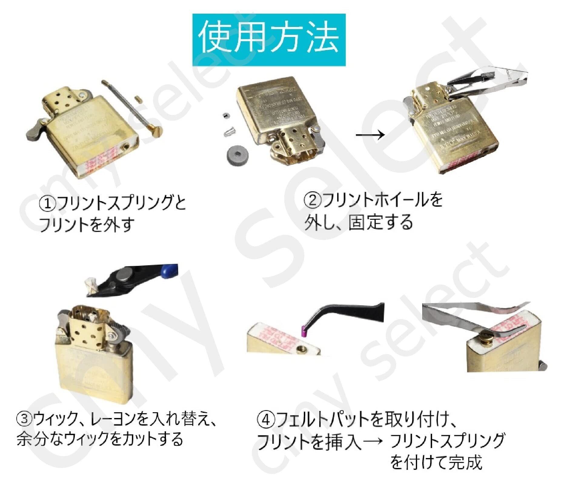 [cmy select] オイルライター メンテナンス キット 5点セット フェルト ウィック レーヨン フリントホイール フリントスプリング 汎用 ライター 部品 替え芯 交換用 ライターオイルセット 20230309-zippo-maintenance-set-a