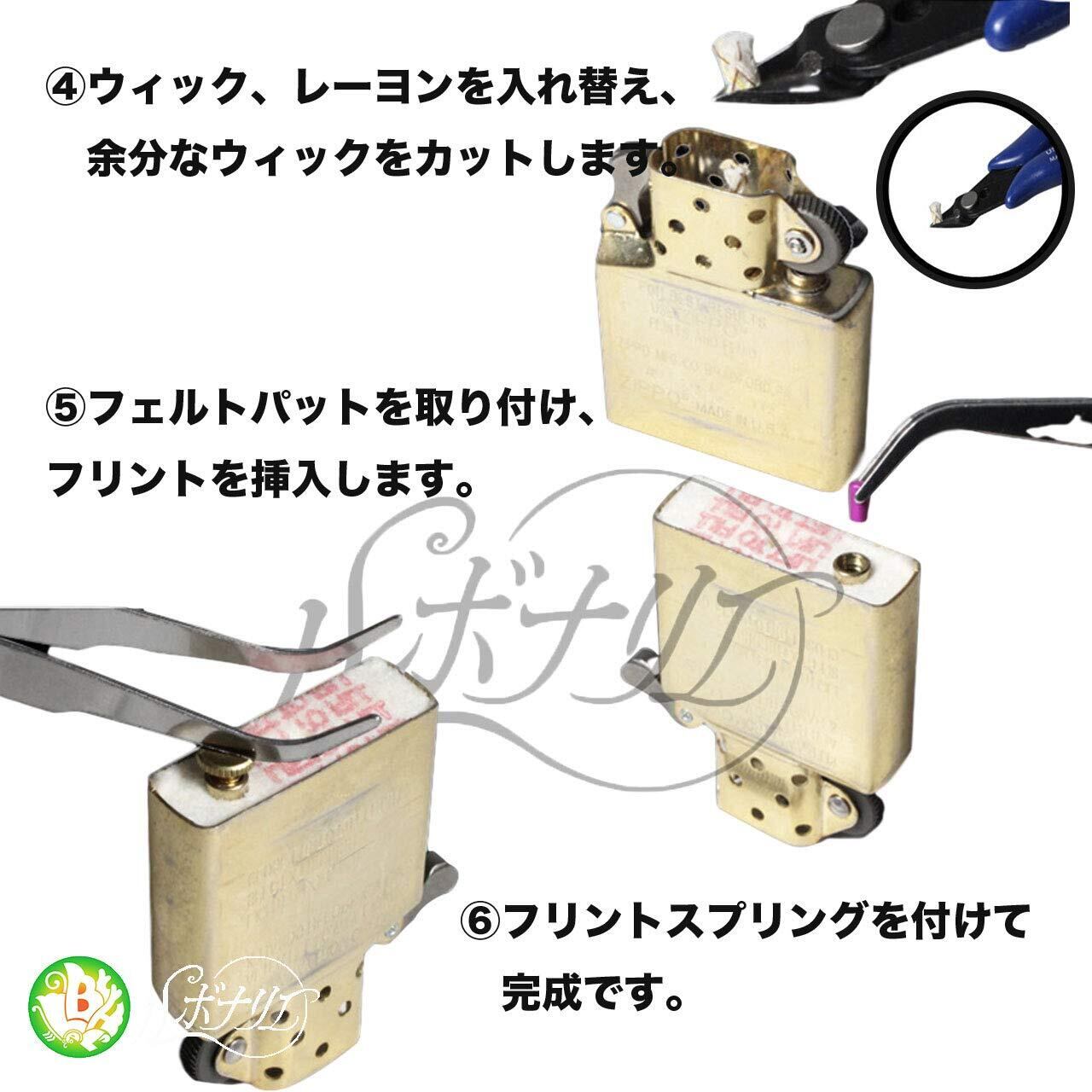 セット内容: ウィック(芯)、レーヨン(綿)、フェルトパッド、フリントホール、フリントスプリング