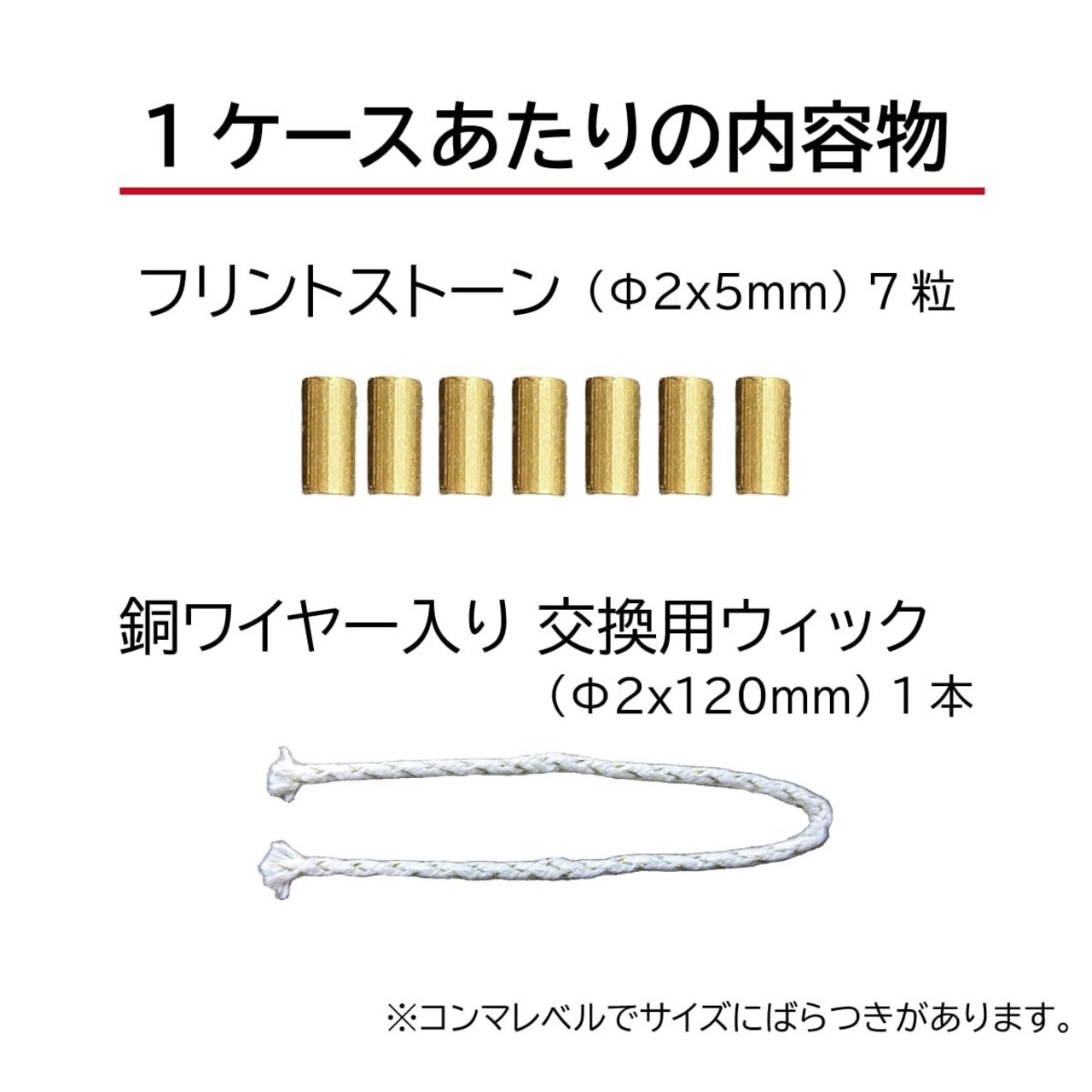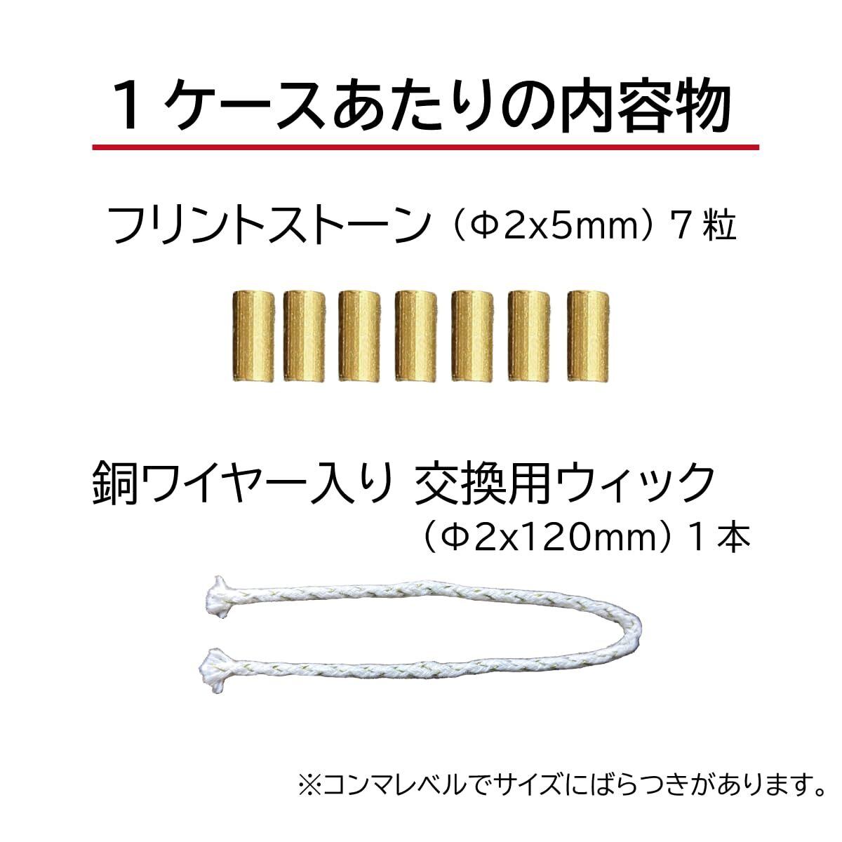 【1ケースあたりの内容物】 ●フリントストーン (Φ2x5mm) 7粒 ●銅ワイヤー入交換用ウィック(Φ2x120mm) 1本 ※コンマレベルでサイズにばらつきがあります。