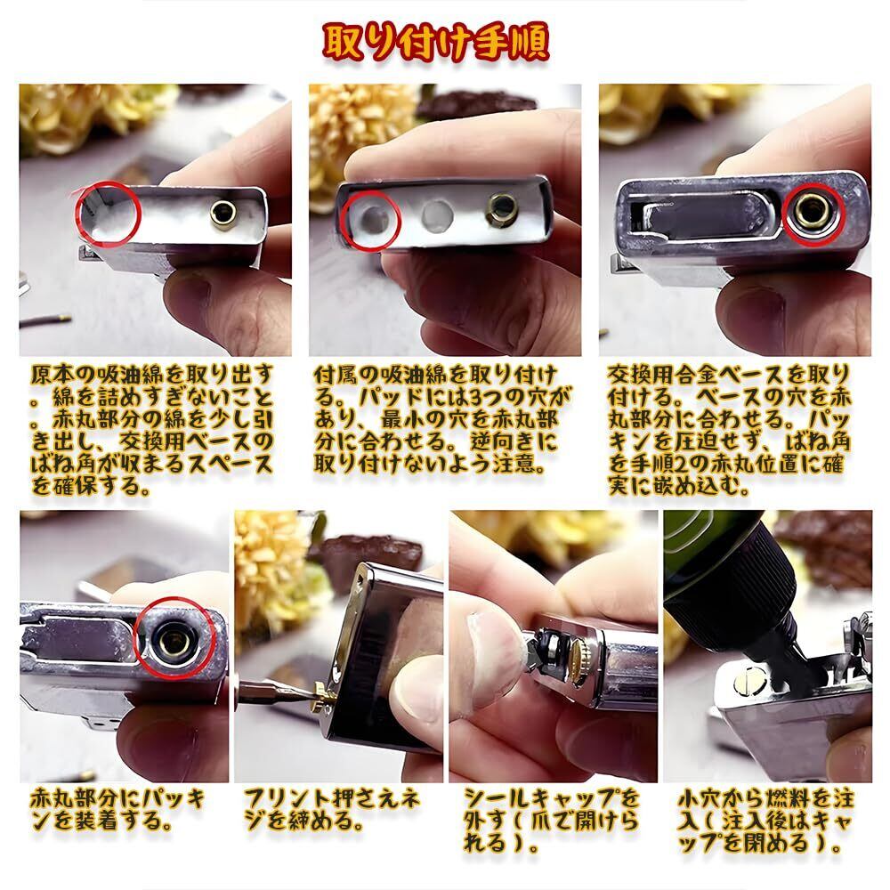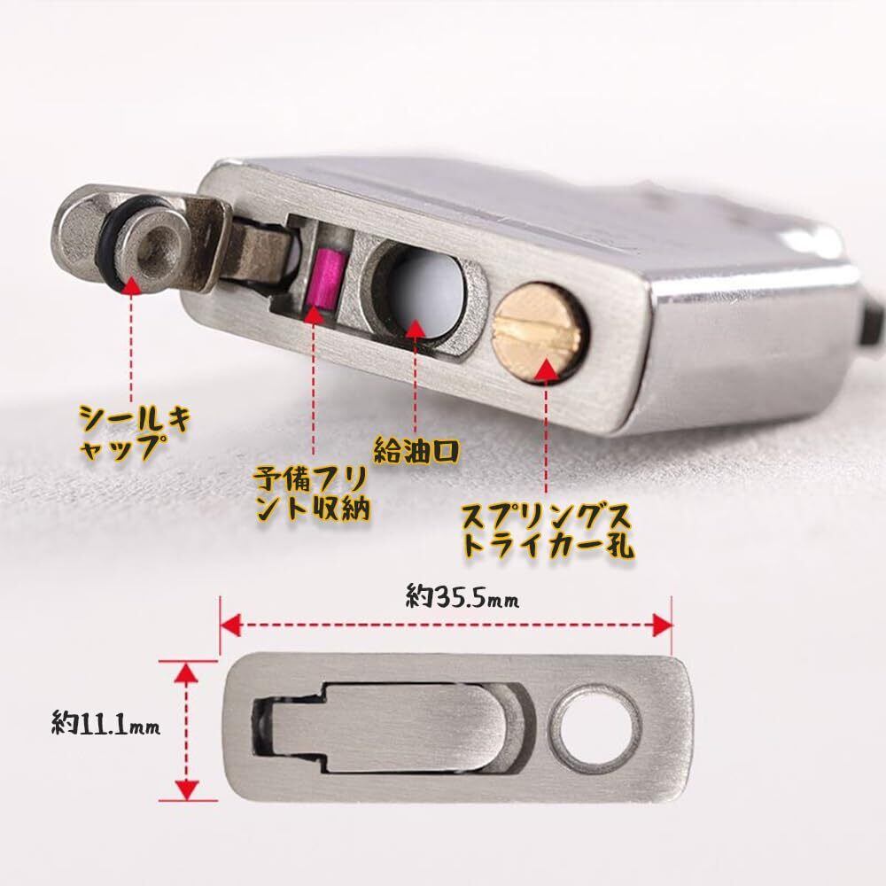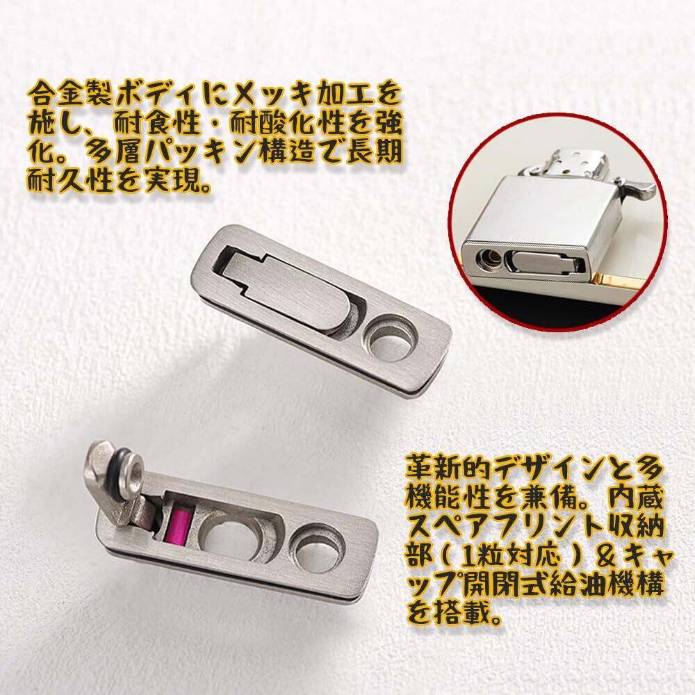 1. 耐熱金属ベース|電鍍銀(シェリング)加工で高級感 熱変形しない金属素材採用。電鍍銀メッキ処理が工具感を排除し、ライター内部ユニットに完璧フィット。重量バランス改良で手になじむ操作性を実現。 2. 3重遮断構造|独自のオイル蒸発抑制システム 燃料孔・火石孔・底面の3点に強化シールリングを配置。耐溶剤性ゴムがオイル漏れを防ぎ、ポケット内の衣類汚染リスクを軽減します。 3.精密寸法設計|36.22×11.5mmで多機種対応 レギュラー/1941/アーマーモデルなど主流ライターに互換。特殊加工綿芯がオイル吸収効率を向上させ、点火成功率を安定化。 4.専属装備付属|火石×3+高密度綿パッド同梱 電鍍銀ベース本体に、耐摩耗火石と撥油処理済み綿パッドをサービス品として追加。メンテナンス頻度を最大60%低減する長期耐久設計。 5. 圧力テスト済|JIS規格準拠の品質保証 1.8気圧テストをクリアした遮断性能。開封即使用可能な完全組立済みキットで、初心者でも3分で交換完了。