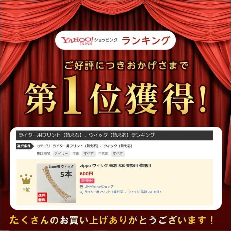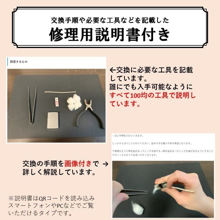 ZIPPO の交換用芯 ウィック 5本セットです! すすで黒ずんでしまい火が着きにくくなってしまった芯の交換用にお使いいただけます。 長時間の使用で芯に火が付きにくくなってしまった方は是非! 【サイズ】 長さ11 cm です。 純製品と同じ長さサイズです。 純製品同様ワイヤー入りで曲げたり戻したりできます。 簡易梱包にて普通郵便で発送します。 防水袋に入れてお送りしますのでご安心を!初めて交換する方のため、手順や必要な工具を記載した説明書サイトをご覧いただけるQRコードを同封いたします。 スマートフォンやパソコンでご覧いただけます。