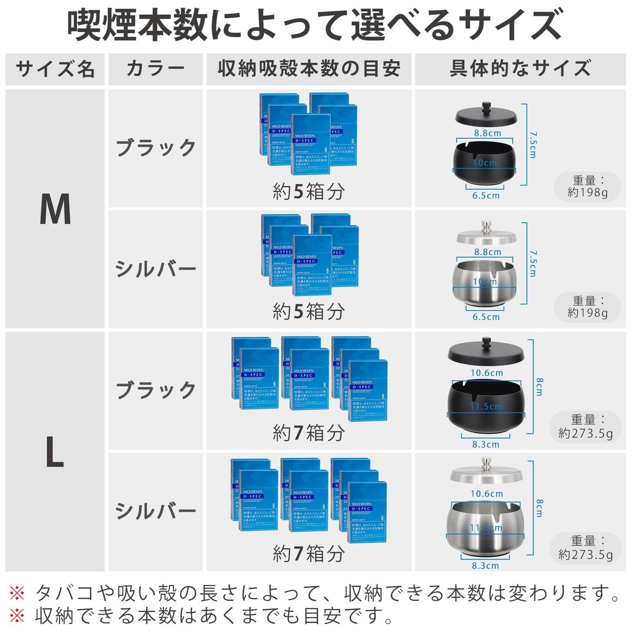 【選べる2色と2つのサイズ】色:シルバー(ステンレススチールの原色) / おしゃれな黒色 サイズ:●M(中)サイズ:タバコ5箱分 最大直径10cm・蓋なしの高さ6cm ●L(大)サイズ:タバコ7箱分 最大直径11.5cm・蓋なしの高さ6.5cm ※サイズが小さいものほど屋内使用向きで大きいものほど屋外使用向きです。