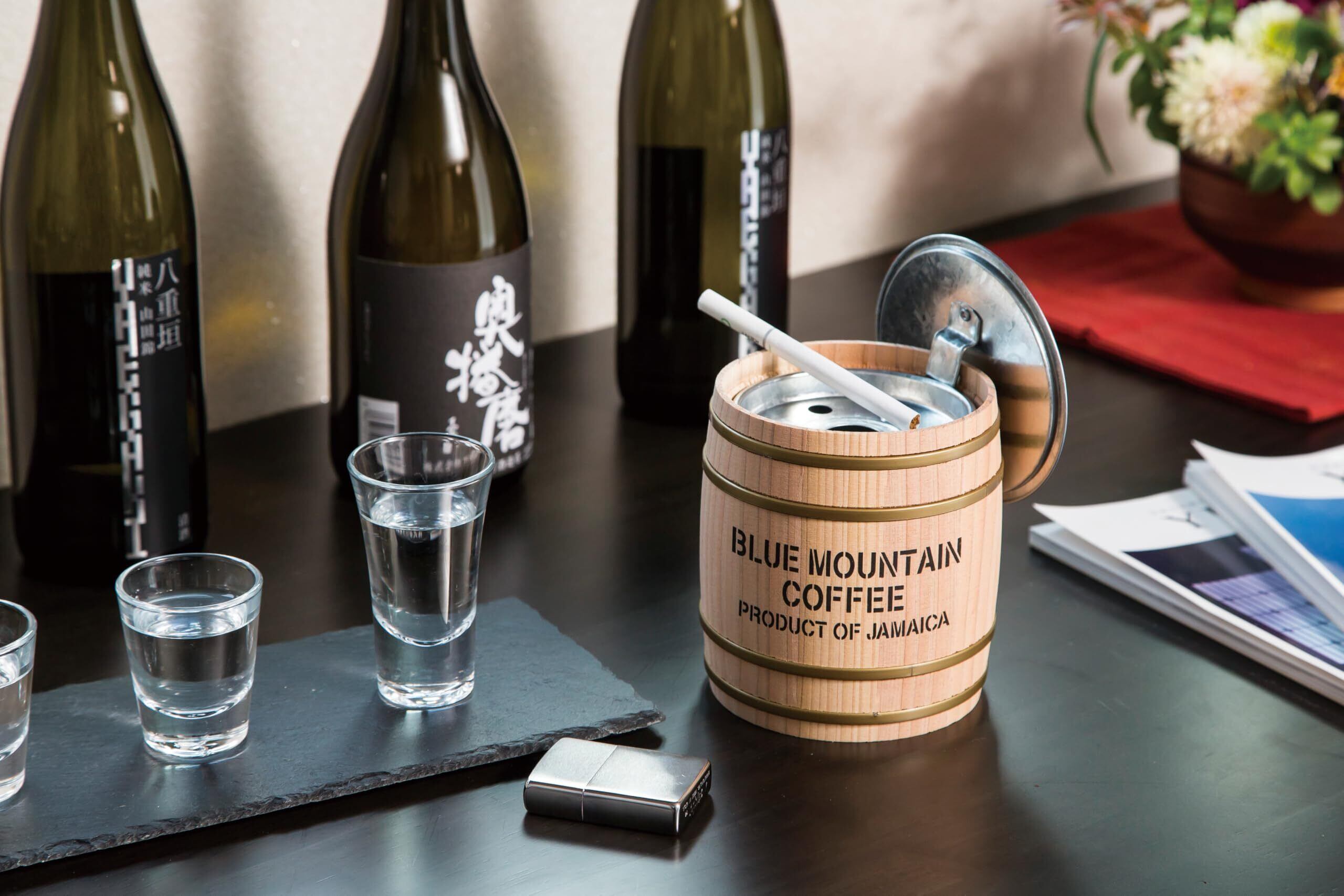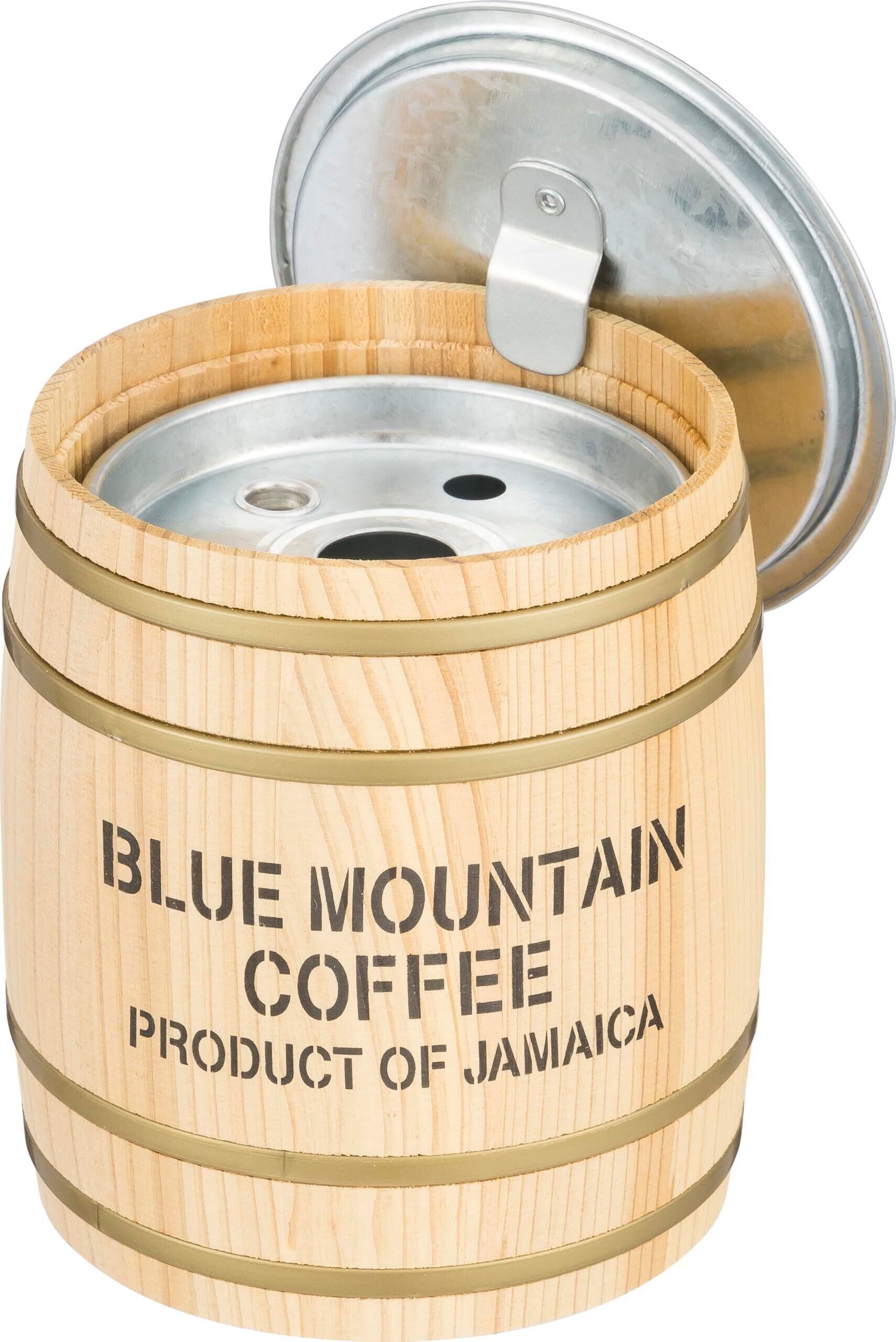 天然木×バケツ型灰皿天然木の素朴な風合いが魅力の木樽に、灰皿をセットしています。バケツには取り出し用ピンが付いているので、洗うときに手が汚れず便利です。内フタには、差し込むと火が消える、消火ストッパーを付けています。