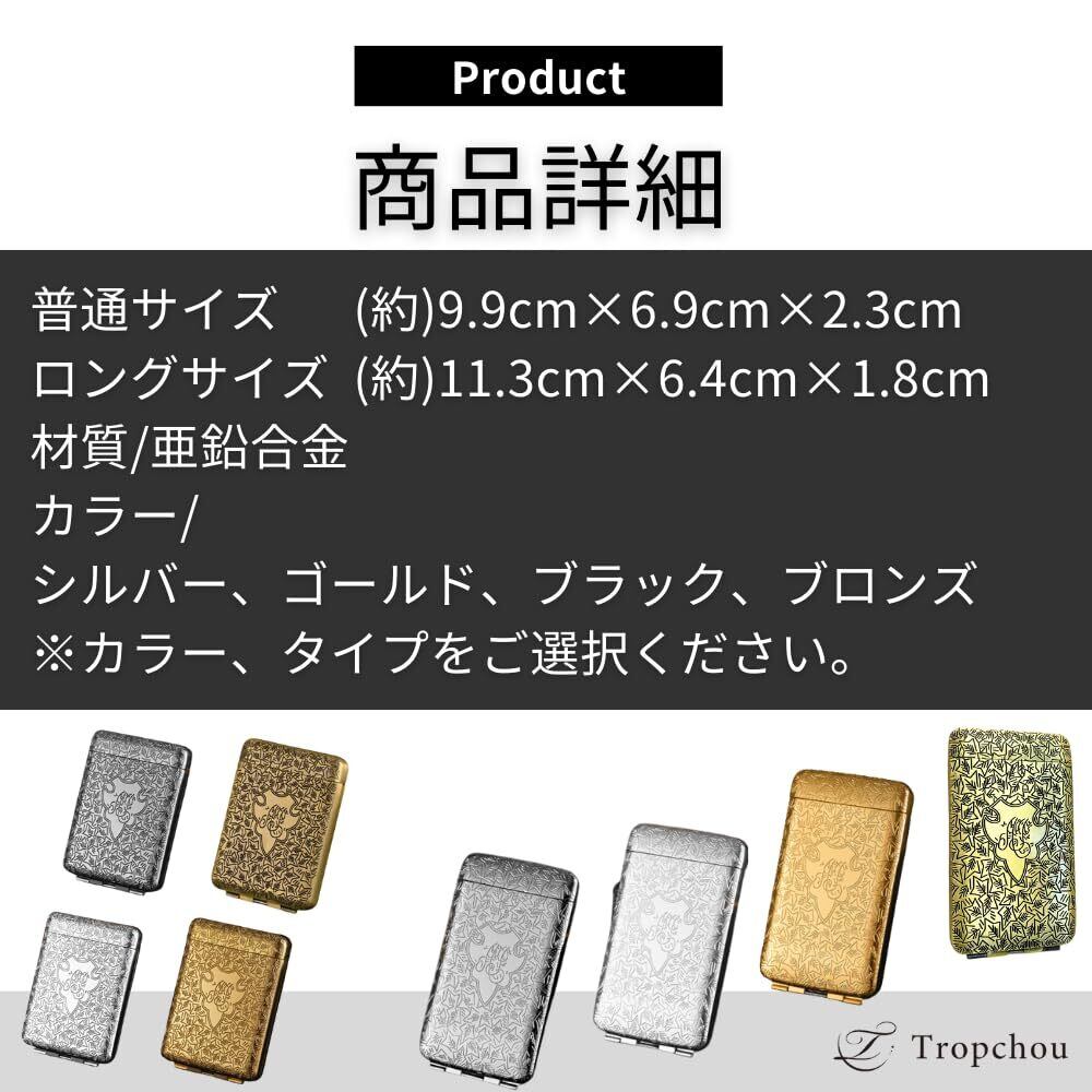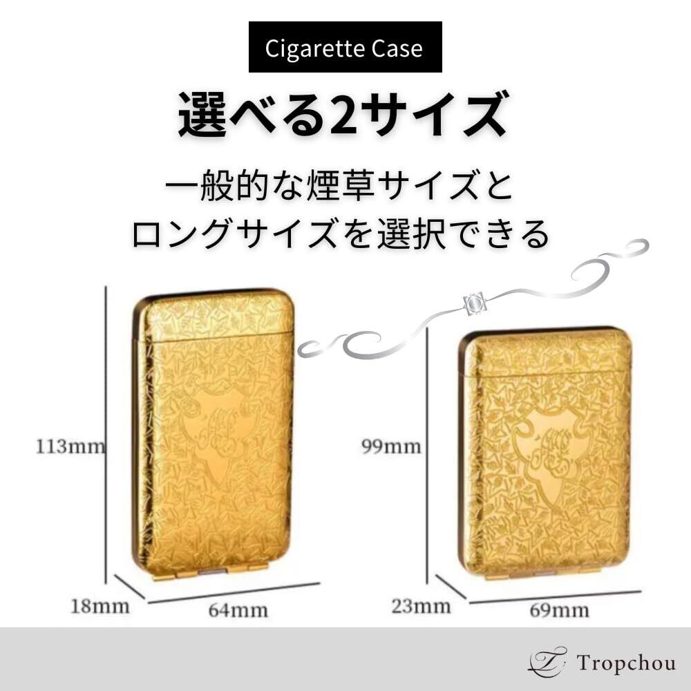 【商品仕様】 サイズ/(約)9.5cm×5cm×1.8cm 一般的なたばこサイズ(70mm~85mm)※ロングタイプ(100mm)は収納できません。 材質/亜鉛合金 カラー/シルバー、ゴールド、ブラック ※カラーをご選択ください。