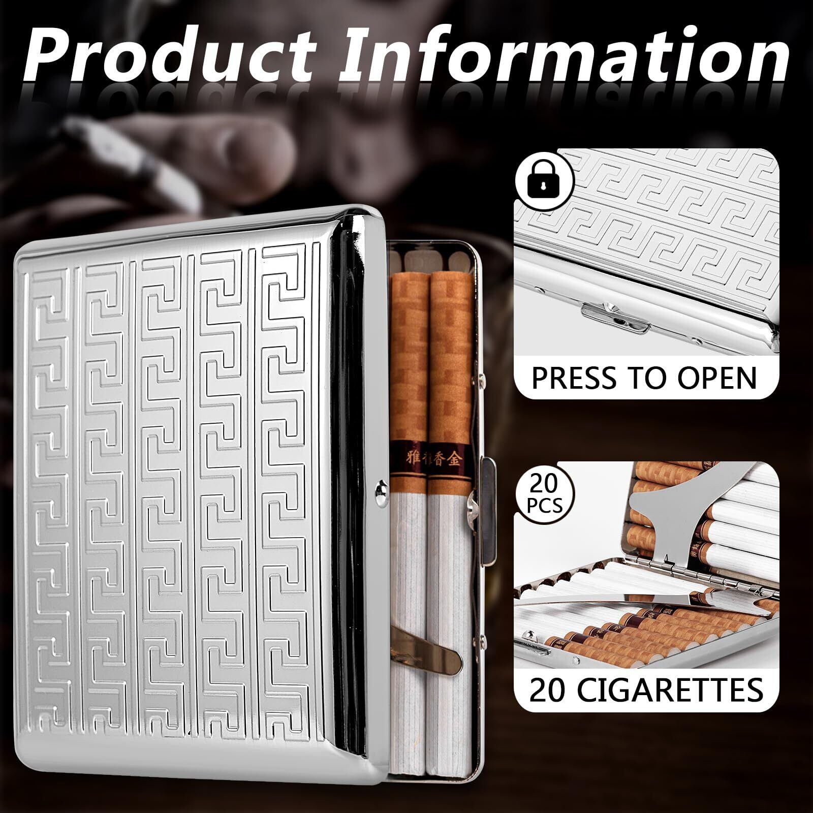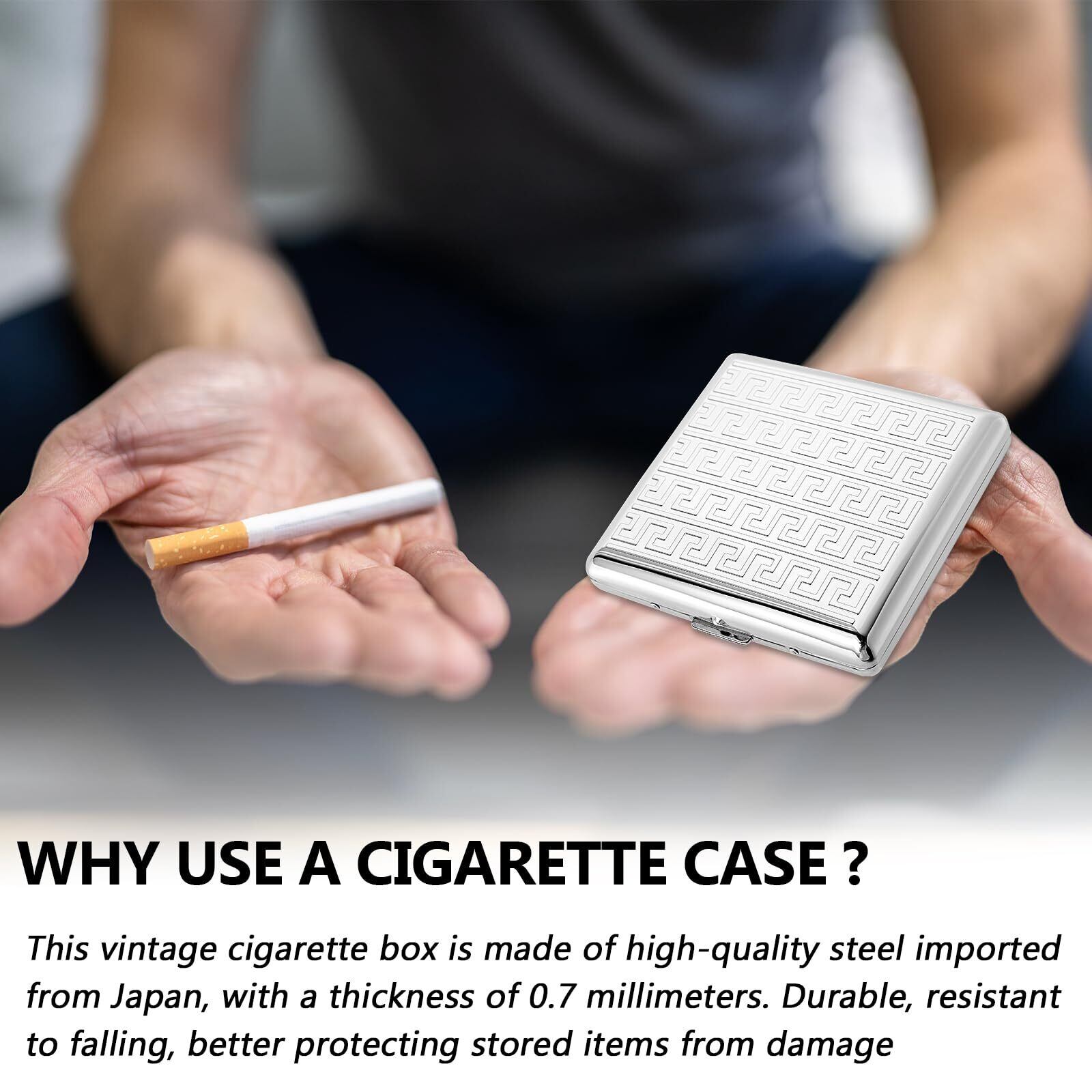 1.耐久性とスタイリッシュ: 日本の高級金属板から作られたこのレトロなメタルシガレットケースは、84mmの超大型タバコ用に設計されており、あなたのタバコが安全で無傷であることを保証します。また、クレジットカード、現金、ティッシュ、その他の日常必需品も収納できます。