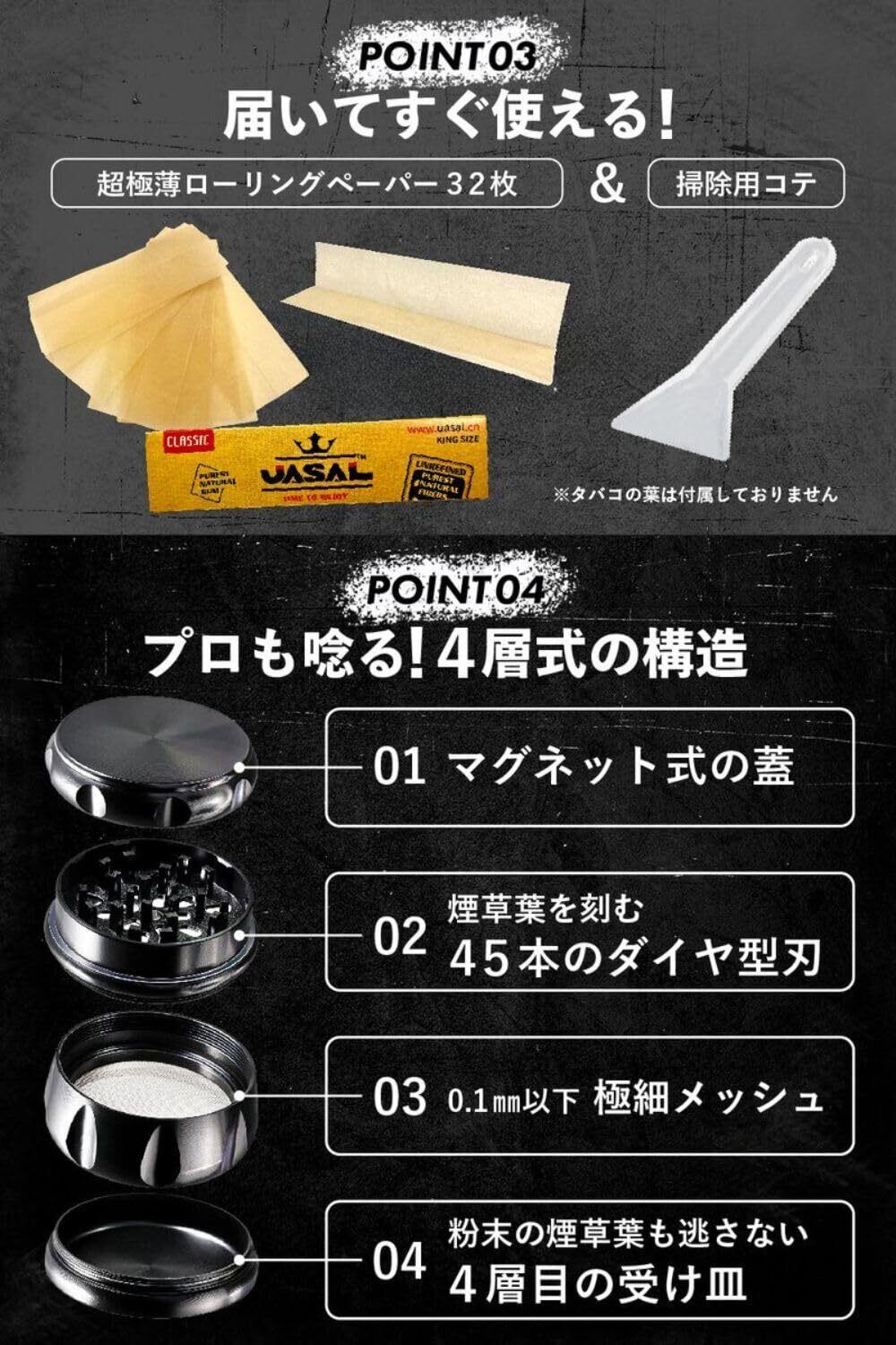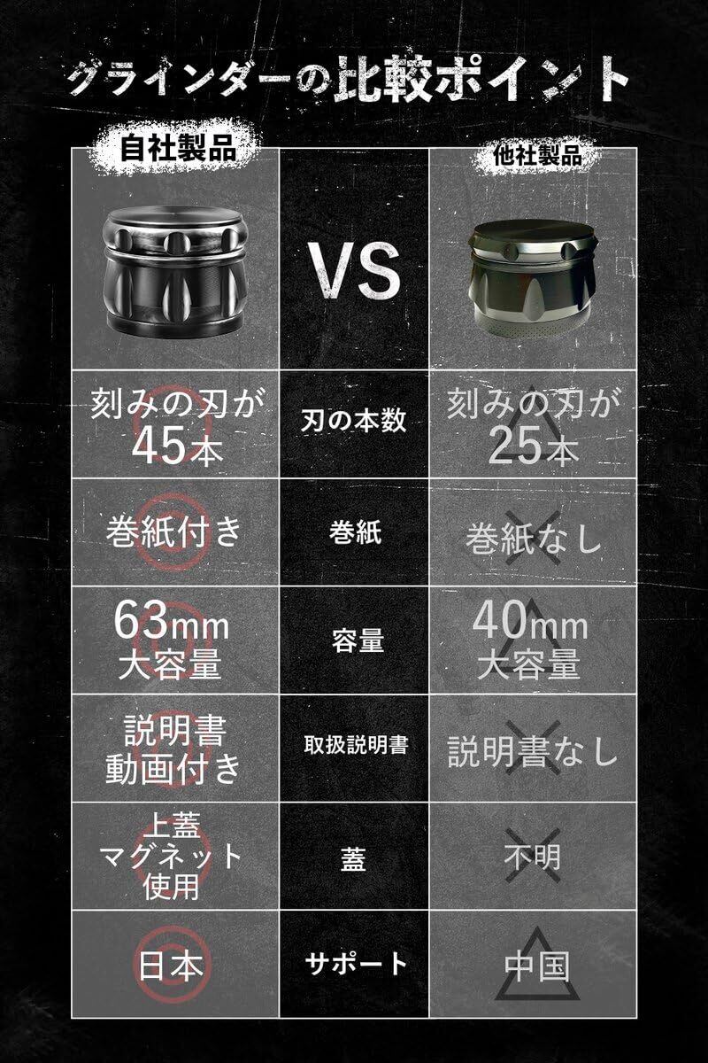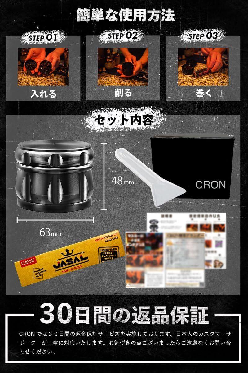 【充実の4点セット 】グラインダー合金製63mm、超極薄ローリングペーパー78mm×44mm、コテ、説明書QRコードにて動画添付