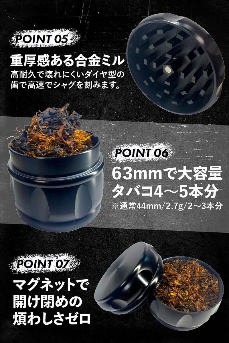 【45本の刃で細かく刻む合金仕様】一般的なグラインダーより刃の数が1.8倍多く、力強く削ることができます。63mmのグランダーは3本〜5本分を一度に刻むことができ、他社商品の1.5倍の量を一度に削れます