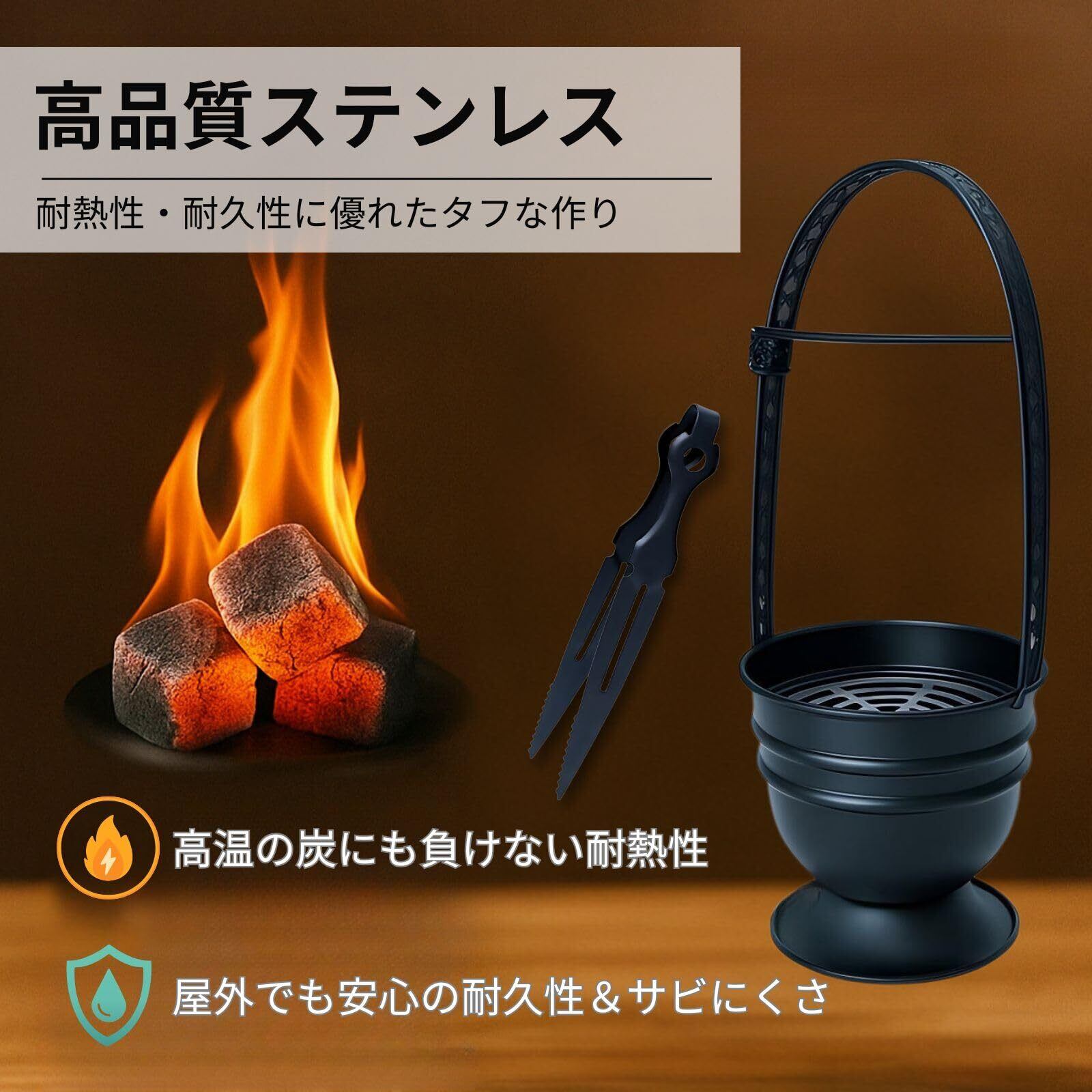 【安全な専用トング付き、多様な熱源に対応】 セットに付属する専用トングは、すべりにくいギザ加工が施され、熱した炭も安全に掴むことができます。シンプルで高級感のあるマット仕上げは、視覚的にも美しく、細部までこだわりのあるデザインです。シーシャ用炭、香炭、BBQ炭など、さまざまな熱源に対応可能です。