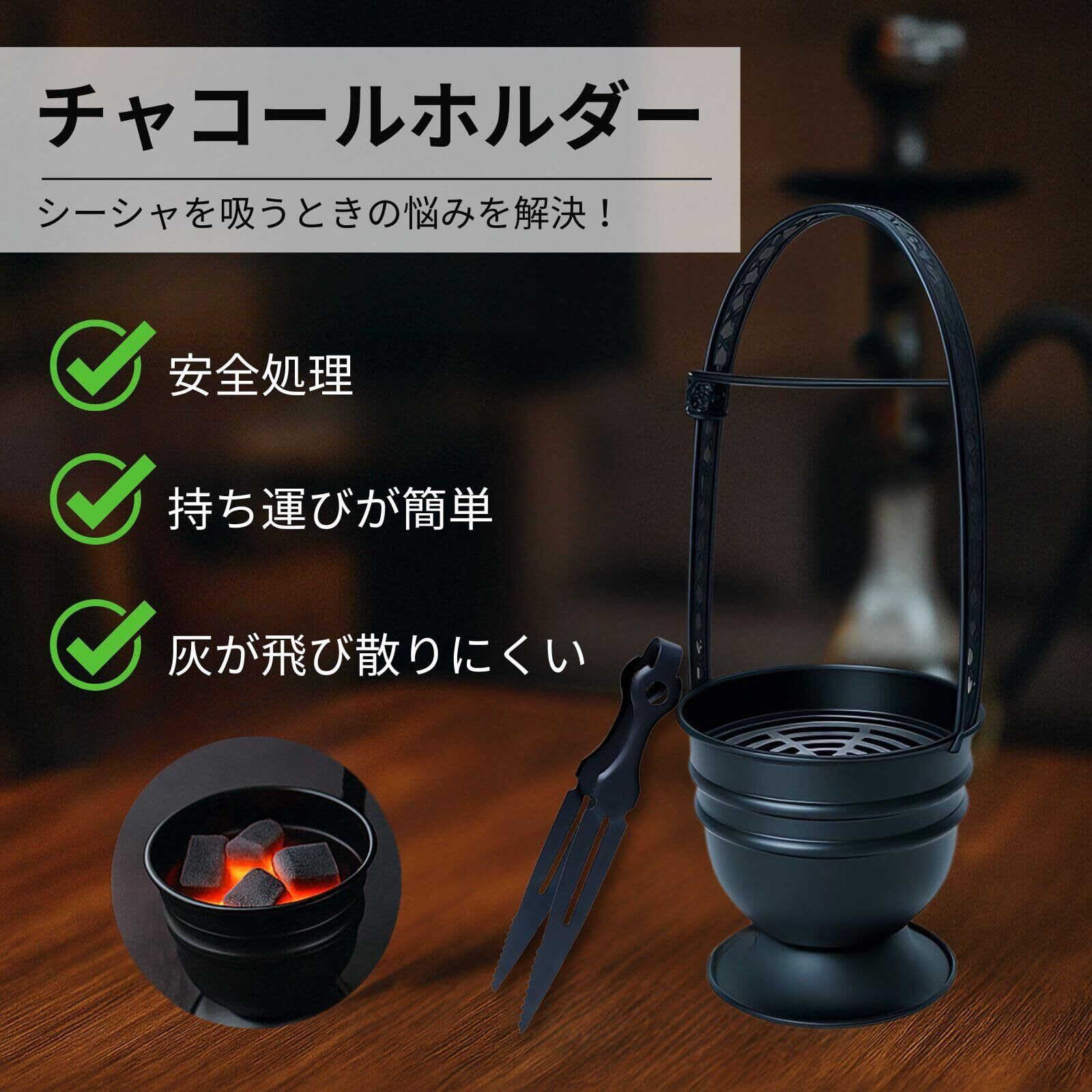 【幅広いシーンで活躍 - 商品仕様】 シーシャ愛好者はもちろん、水タバコ初心者にもおすすめのアイテムです。自宅やキャンプ、ベランダ喫煙など、あらゆるシーンで活躍します。ギフトやサプライズプレゼントとしても喜ばれるアイテムです。 サイズ: バスケット高さ(取手含む):約35cm、間口直径:約13.5cm、底部直径:約12.9cm/トング長さ:約23cm、 素材: ステンレス鋼