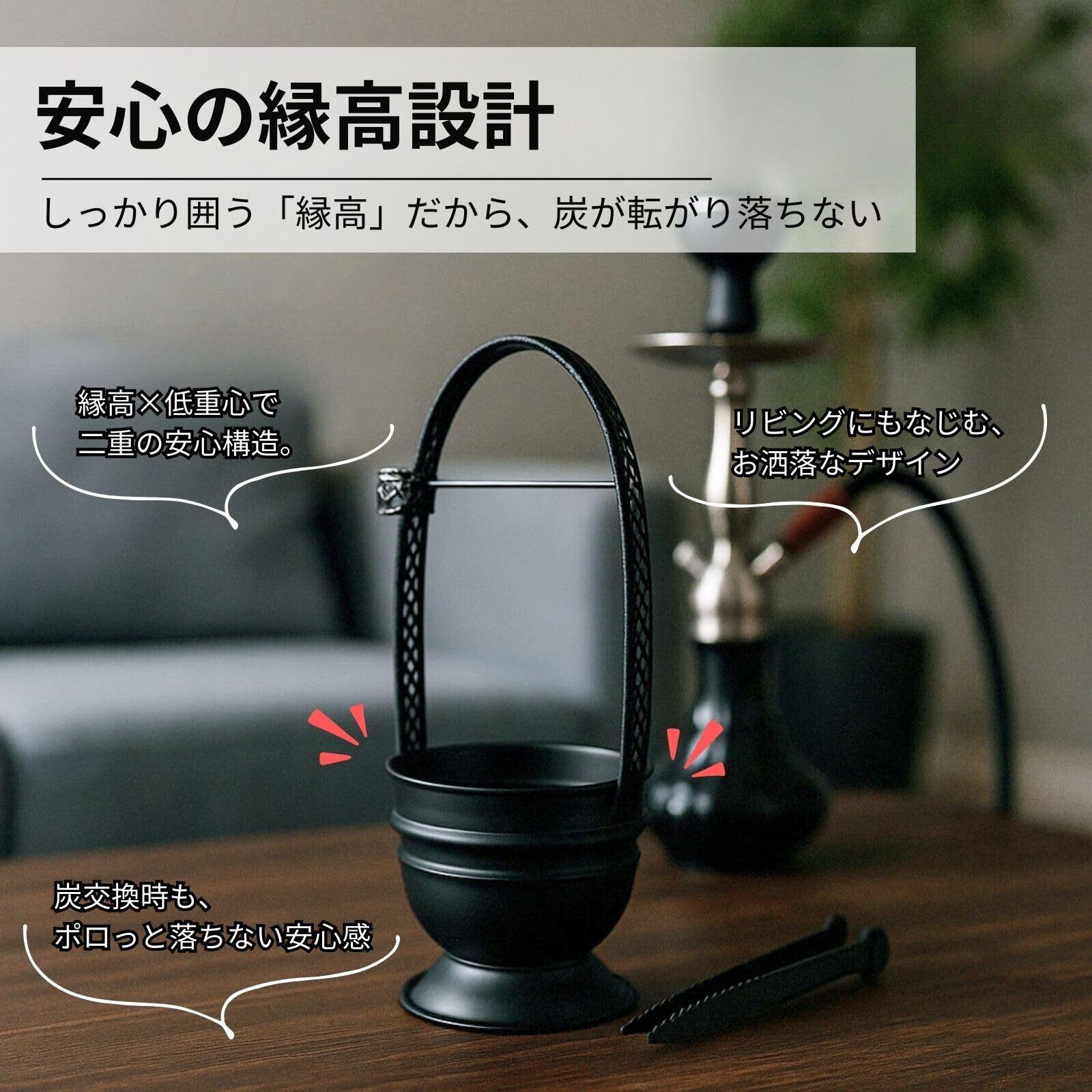 【スタイリッシュなデザインと安全な構造】 本体は花籠のようなスタイリッシュな形状で、インテリア性にも優れています。縁がやや高めの設計で、屋外や風のある環境でも炭が飛び出しにくく、安定感のある構造です。シーシャを楽しむ際の炭交換や火加減の調整もスムーズで、快適な喫煙体験をサポートします。
