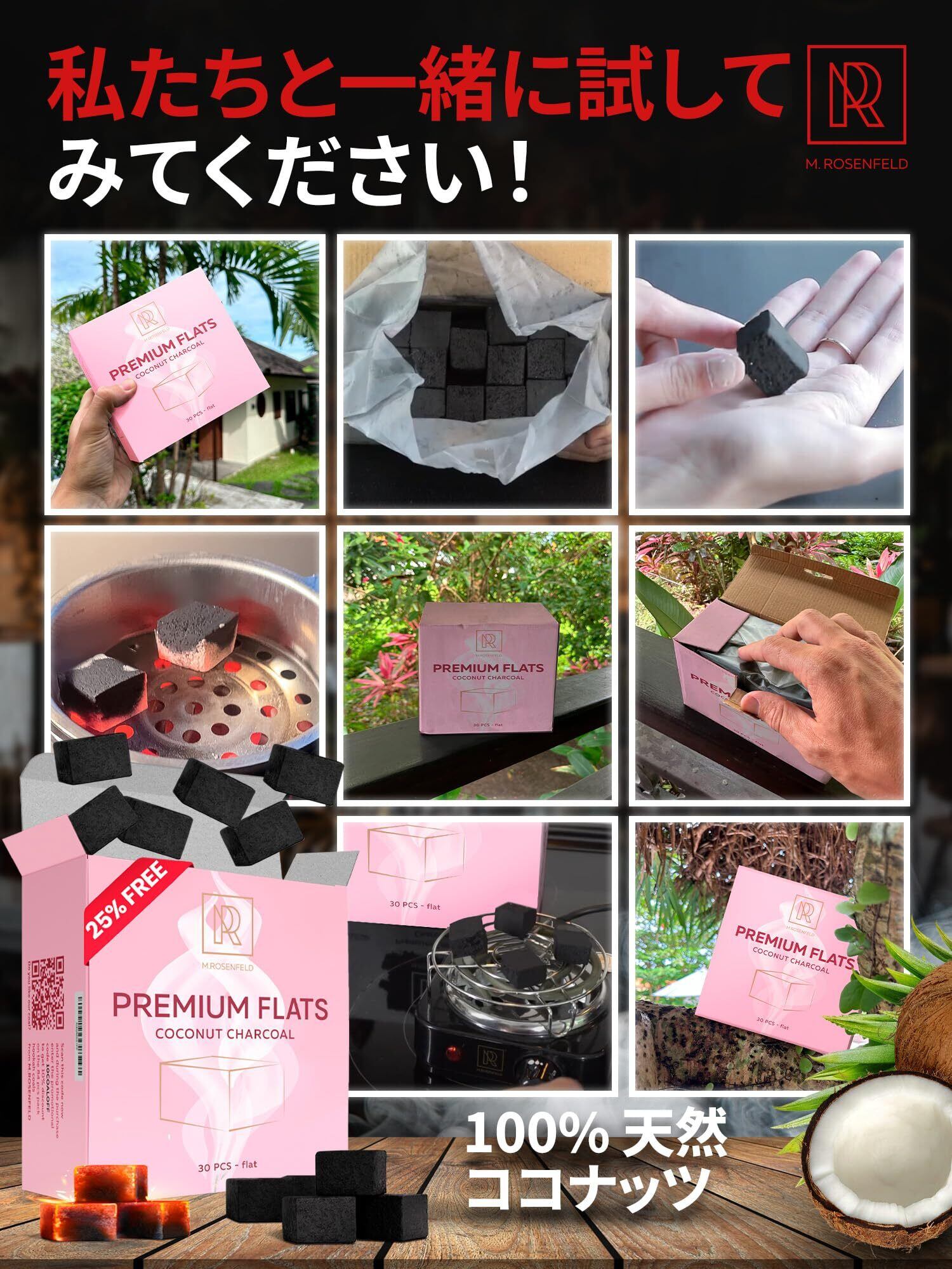 【100%天然ココナッツ】M. ROSENFELDのシーシャ炭はココナツ殻のみを使用し、不純物0%。無臭・無添加でフレーバー本来の味を邪魔しません。初心者にも扱いやすく、自宅・カフェ・シーシャバーで快適に楽しめます。