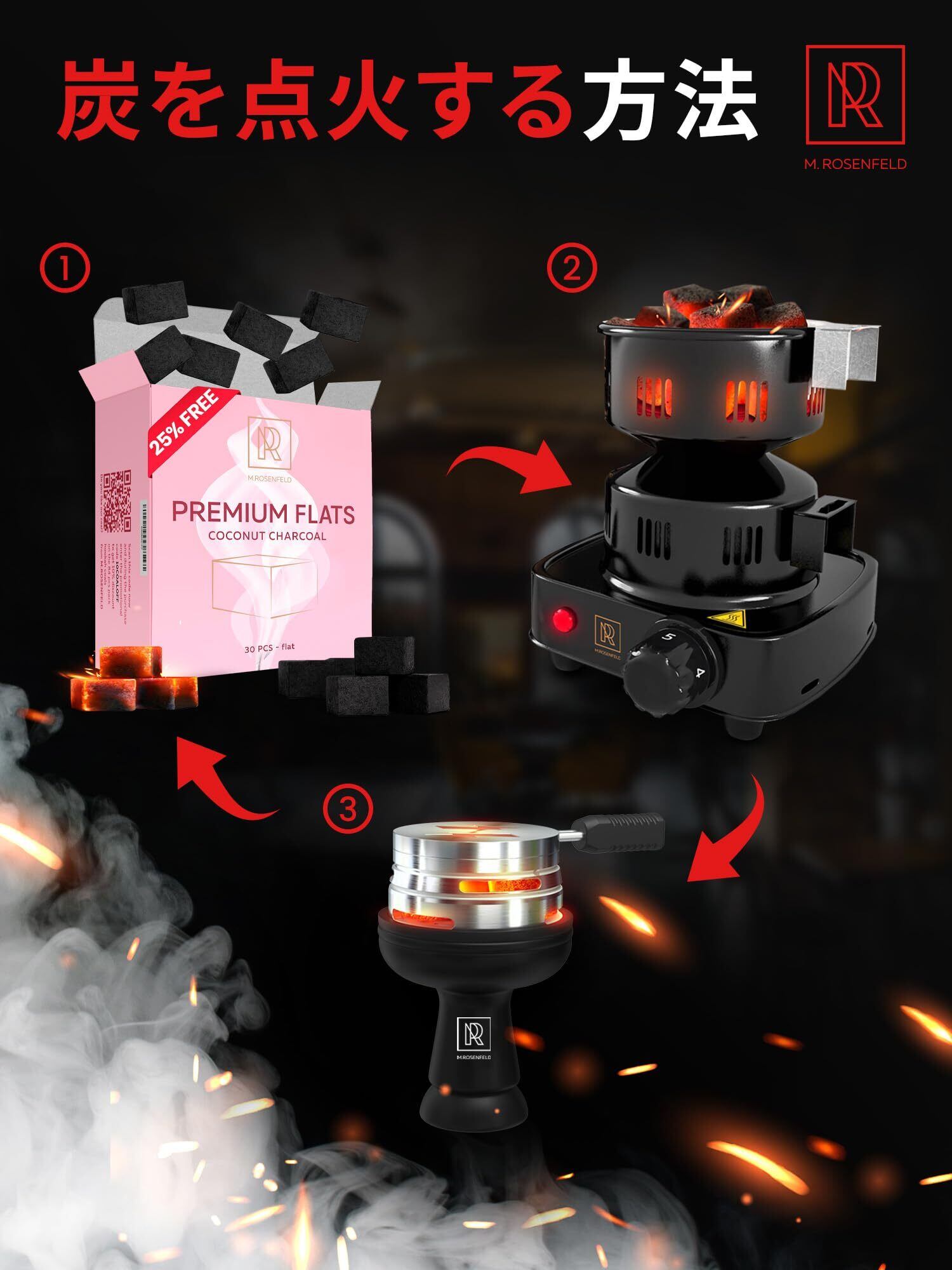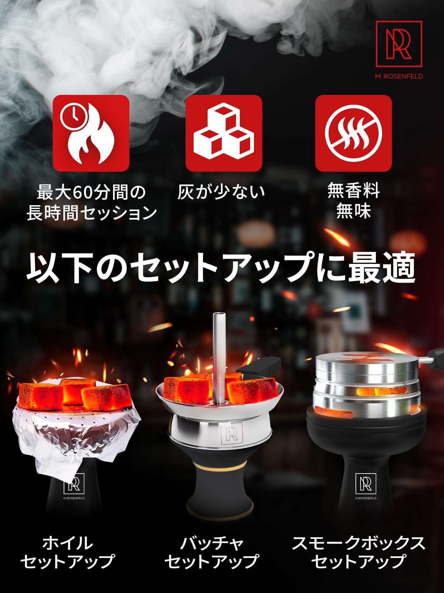 【天然炭専用バーナー推奨】着火剤を使用していないためポケットライターでは点火不可。必ず専用のシーシャ炭バーナーをご利用ください。M. ROSENFELDのフラット炭は煙・匂いを抑え、ギフトや特別なシーシャタイムにもぴったりです。