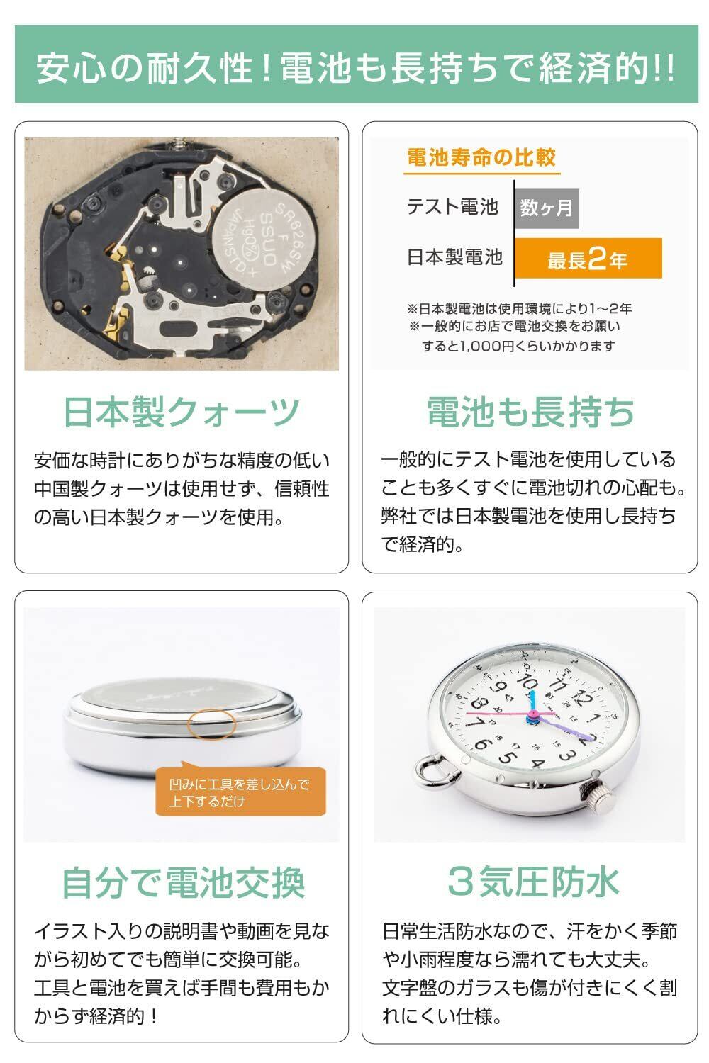 【 お子さんの時間勉強にもおススメ 】針と数字の色がリンクしているので、時間読みのサポートとして使えます。 【 自分で電池交換可能 】自分で 電池交換可能 なので経済的!(電池交換をお店にお願いすると一般的に1000円程度の工賃がかかります)※別売りの電池交換工具をご購入くださいませ。 【 濡れにも強い防水仕様 】*仕事で手洗い等や水場で使用する時にも安心な3気圧防水を採用! _