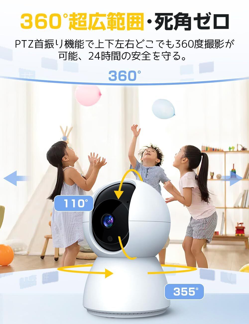 【自動追尾・動作検知・双方向通話】この見守りカメラは高感度センサー搭載、左右にしか追跡しないカメラと比べて、こちらの動く対象を自動で上下左右追跡します。また、動きを検知すると即座にスマホに通知、仕事中や外出先でも家の状況をすぐに把握できます。ペットや子どもの見守り、高齢者介護に最適。双方向通話機能でペットや子どもに声かけもできるため、トラブルの早期発見と対応が可能なスマートカメラです。