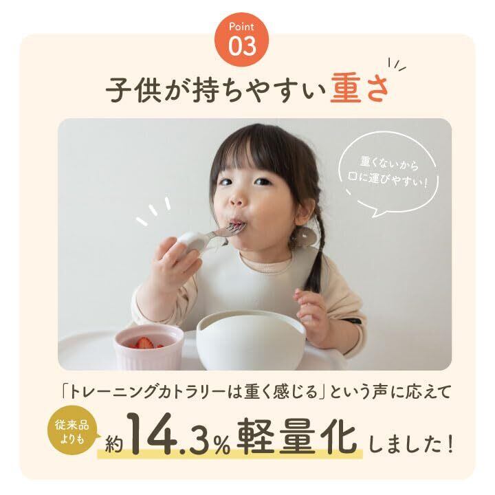 【食べやすいからお食事がどんどん楽しくなる】 フォーク先端は凸凹のデザインで麺類や果物類などが滑り落ちない設計になっています。 また、スプーン先端は平らになっているので、お皿の隅まですくいやすい設計になっています。 お子様に“できる喜び”を体験してもらいやすい独自デザインが完成しました。