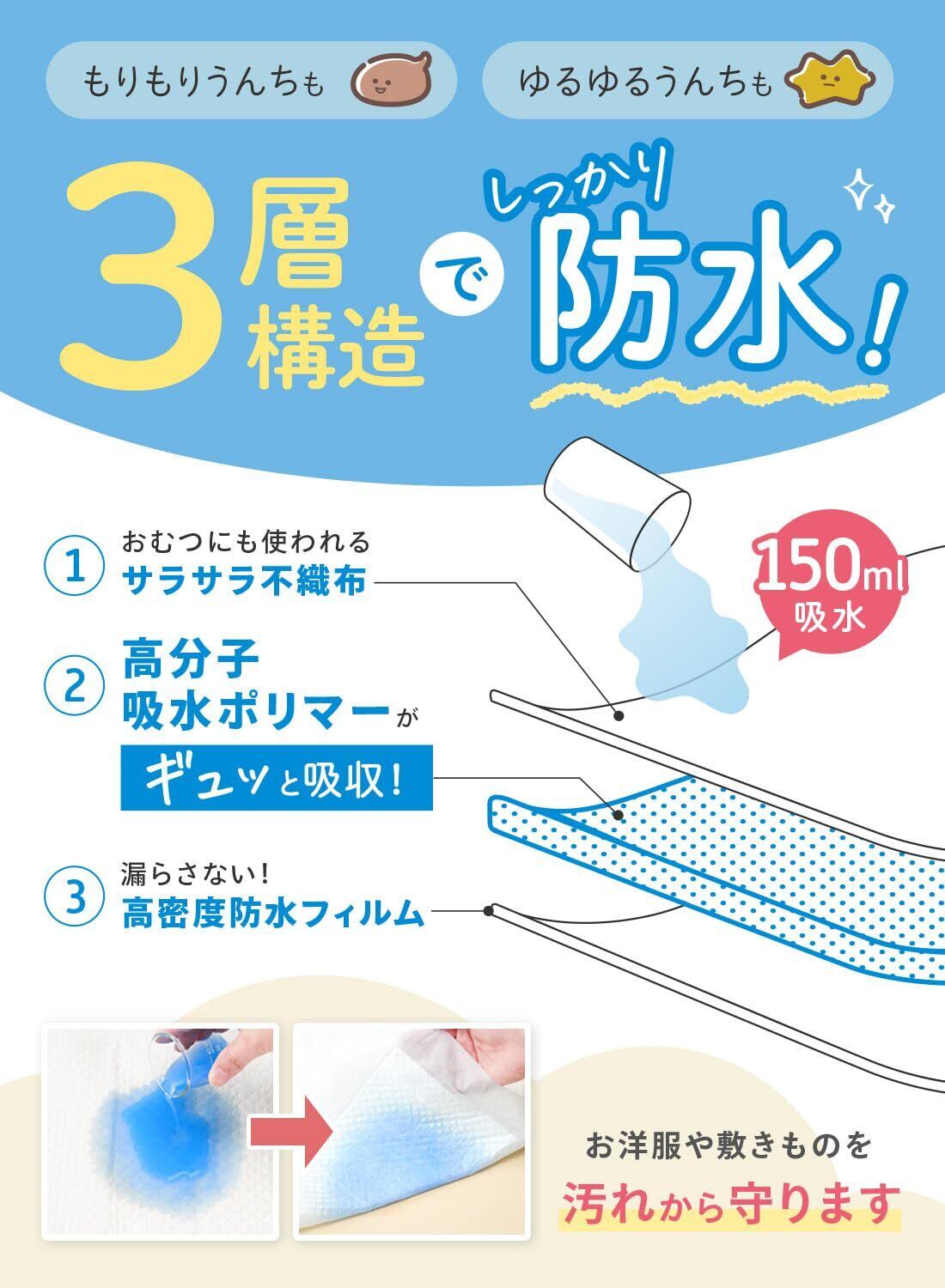 【安心の150ml吸水仕様だからおしっこが漏れても安心】 ケラッタのおむつ替えシートは安心の150ml吸水仕様だからシートがおしっこをしっかり吸収します。布団の下に敷いておけば汗もしっかり吸収してくれます。
