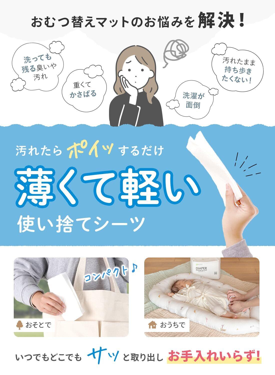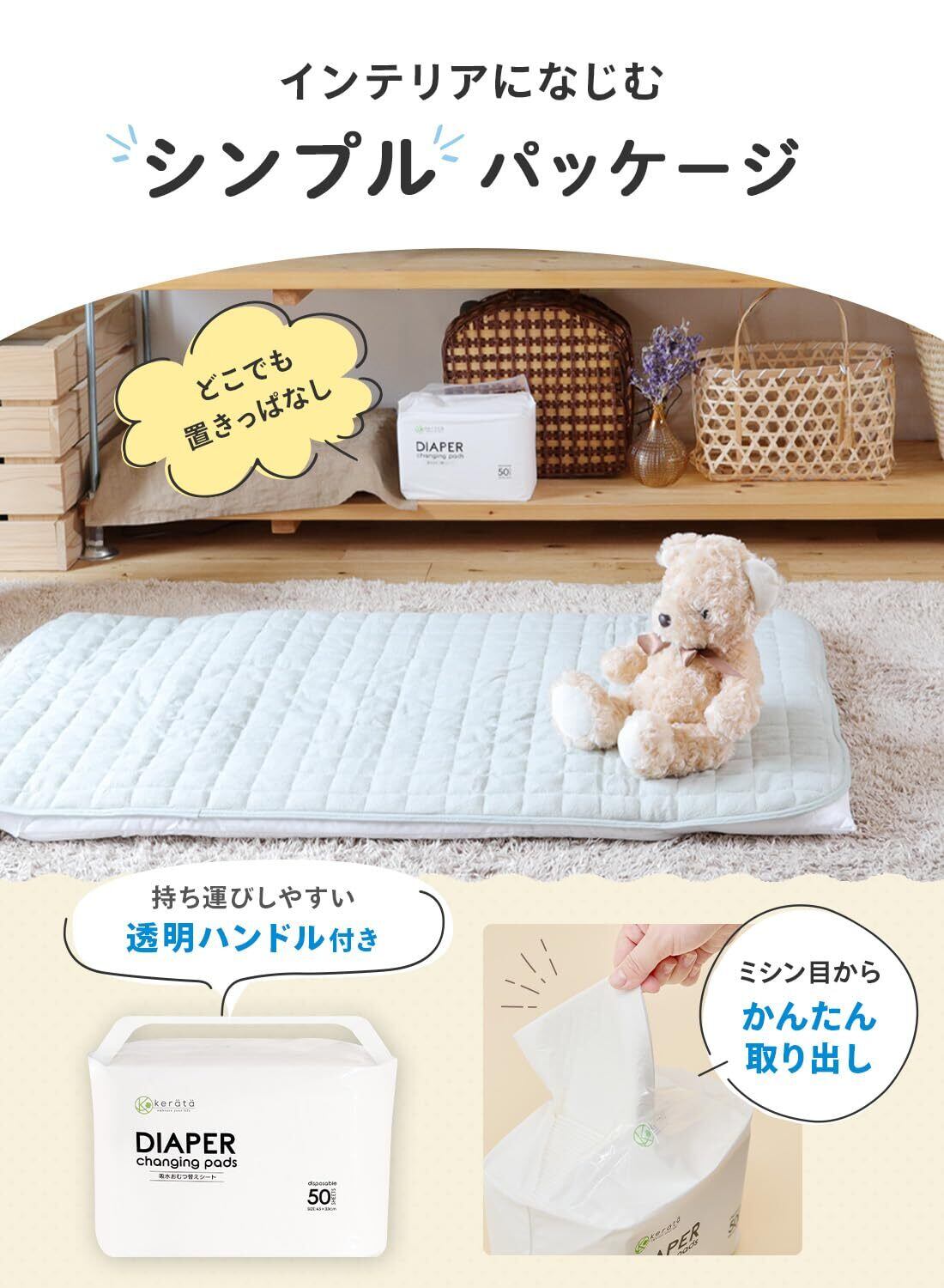 【お片付けも簡単使い捨ておむつ替えシート】 ゆるゆるうんちのおむつ替えもこれで安心!出先でおしっこやうんちが漏れてしまった経験がありませんか。そんな時にケラッタのおむつ替えシートがあれば車やお布団を汚さずにおむつ交換ができます!使い捨てタイプなのでシートが汚れてしまってもお片付けが簡単、たたんでゴミ箱にポイするだけ自宅ではもちろん、お出掛けの際におむつポーチに入れておけばいつでもどこでも使えます。