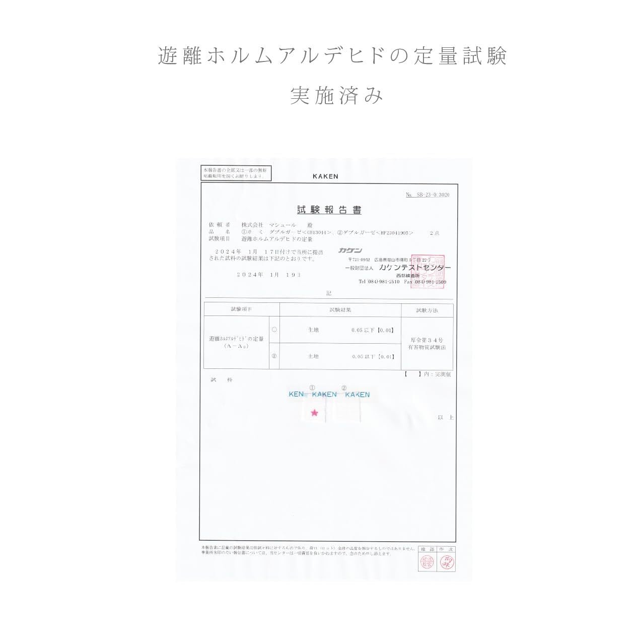 ノンホルマリン:遊離ホルムアルデヒドの定量試験済