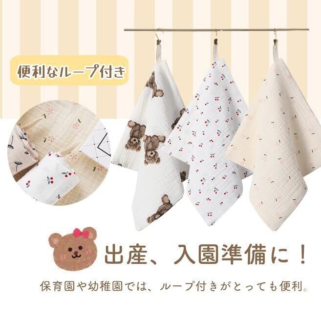【便利なループ付きハンカチ】保育園や幼稚園では、ループ付きがとっても便利です。赤ちゃんのヨダレや汗を拭いたり、さまざまな用途にご利用いただけます。