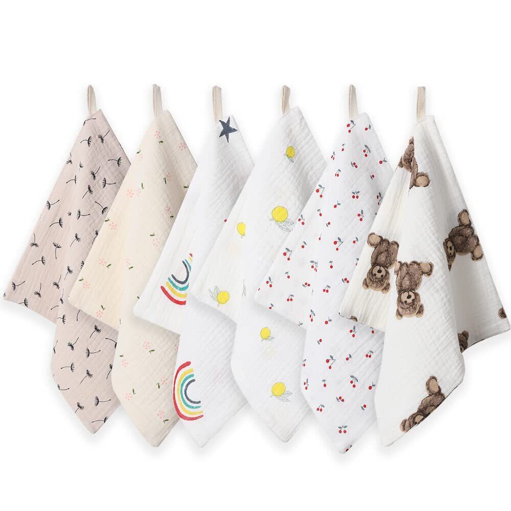 【素材】綿(100%天然素材)【サイズ】25*25cm 【セット】6枚 【柔らかく肌触りが良いハンカチ】優しい風合いのイブルガーゼは赤ちゃんの肌を繊細に柔らかく包み込みます、速乾性·保湿性も優れます、毎日使いやすい素材です。洗いほど柔らかくなります。 【4重ガーゼ&天然綿100%】天然綿100%のガーゼハンカチは安全な天然素材コットンのガーゼでできているので、デリケートなベビーや子どもにも安心に使えます。 【便利なループ付きハンカチ】保育園や幼稚園では、ループ付きがとっても便利です。赤ちゃんのヨダレや汗を拭いたり、さまざまな用途にご利用いただけます。【可愛いデザイン】可愛い絵柄を盛り込んだ12枚セット、その日の気分や服に合わせてお選べいただけます。出産準備や出産祝いやベビーへのプレゼントとして最適です。