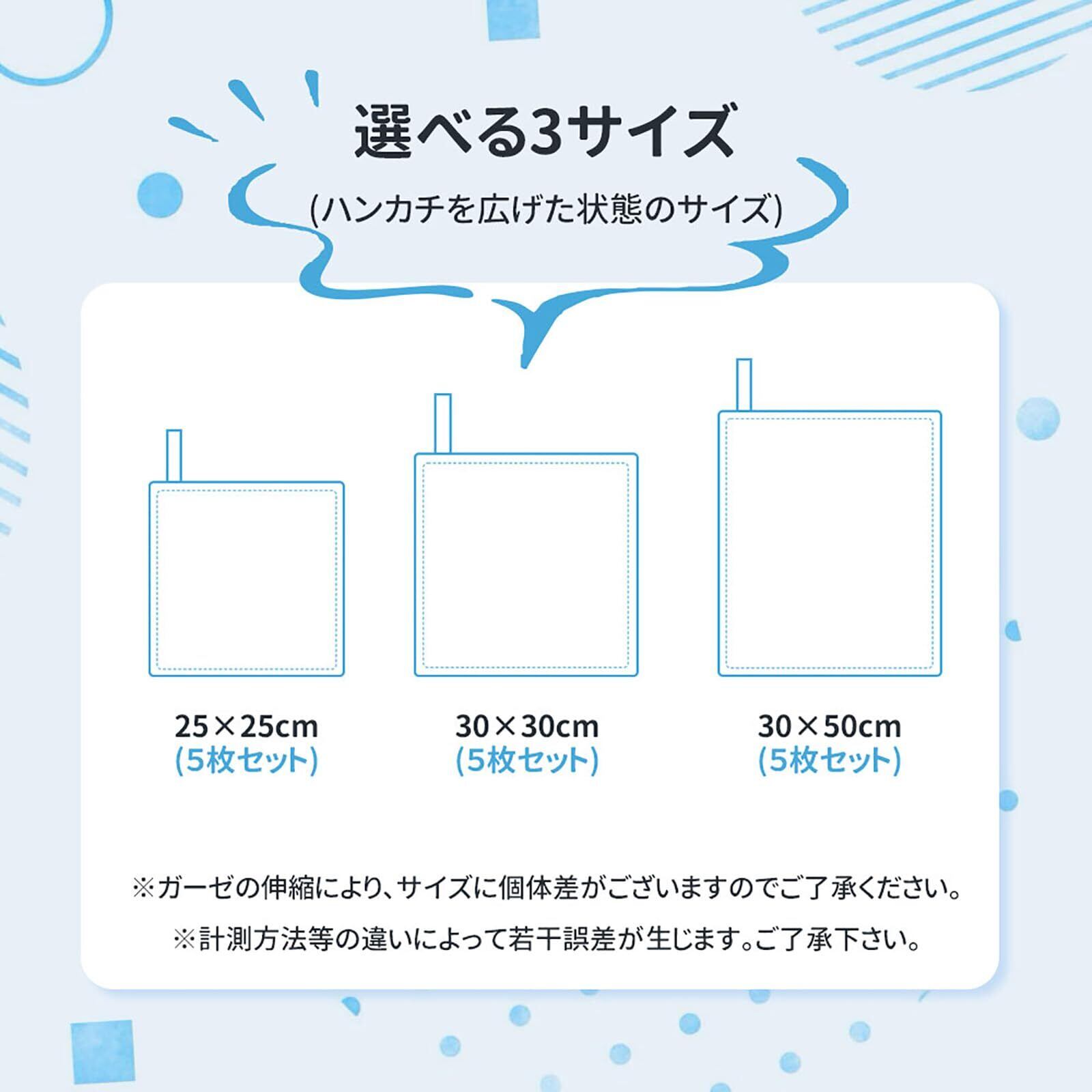 サイズは25cm×25cm、30cm×30cm、30cm×50cmの3種類から選べ、用途に応じて最適なサイズをお選びいただけます。(伸ばした後のハンカチの大きさ)