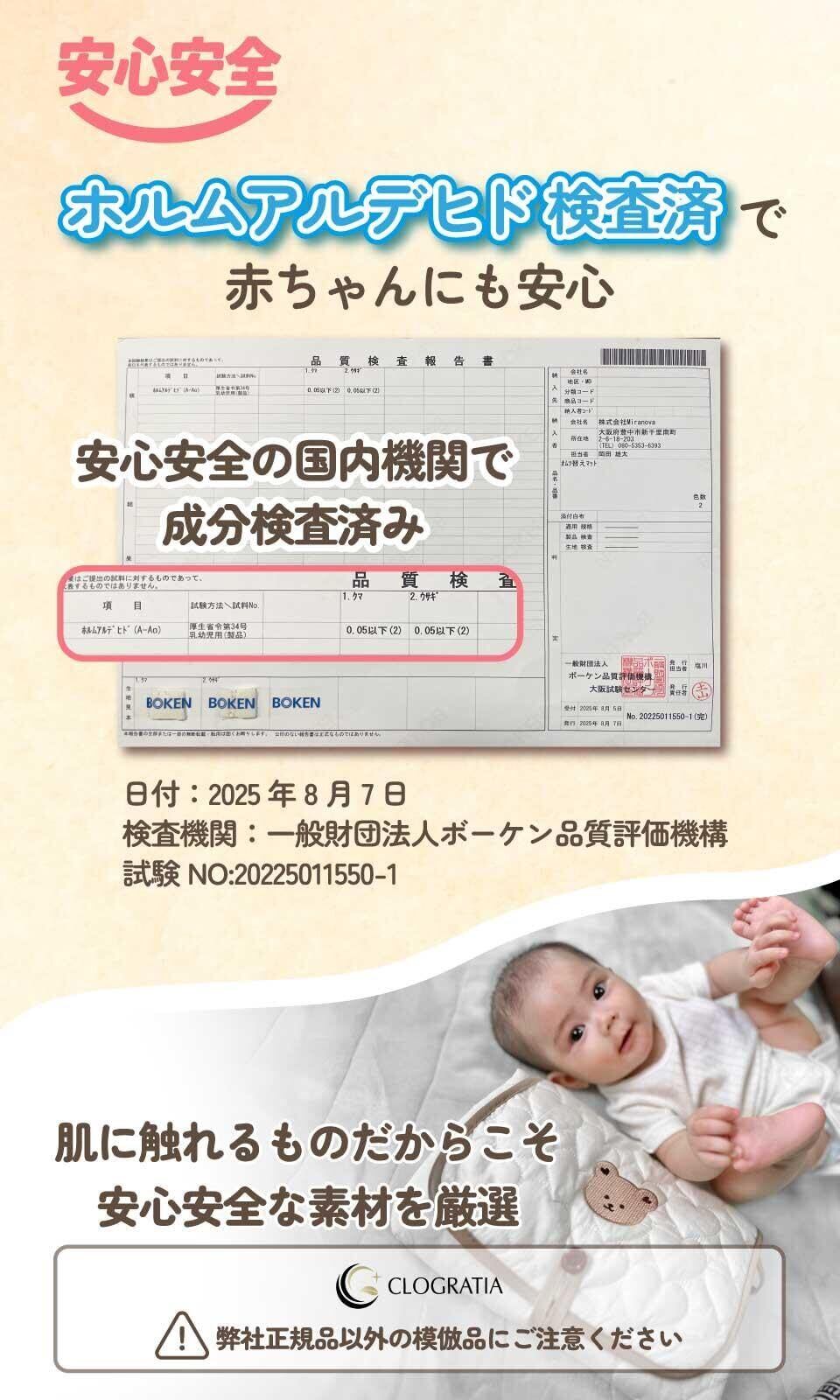 【国内公的機関でホルムアルデヒド検査済】赤ちゃんの肌に触れる商品だからこそ、安全性を最優先。公的検査機関にて検査済みで安心してご使用いただけます。