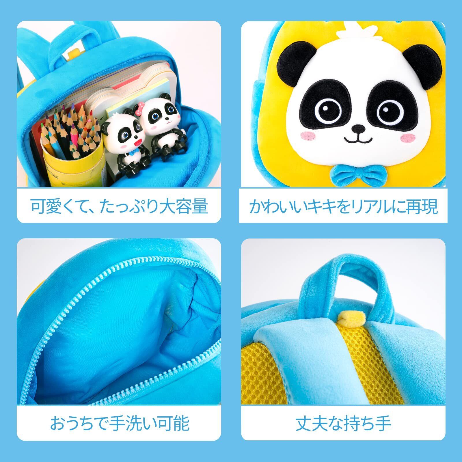 【可愛い動物たちリュック】かわいいパンダ「キキ」の子ども用リュック、ストラップデザイン。