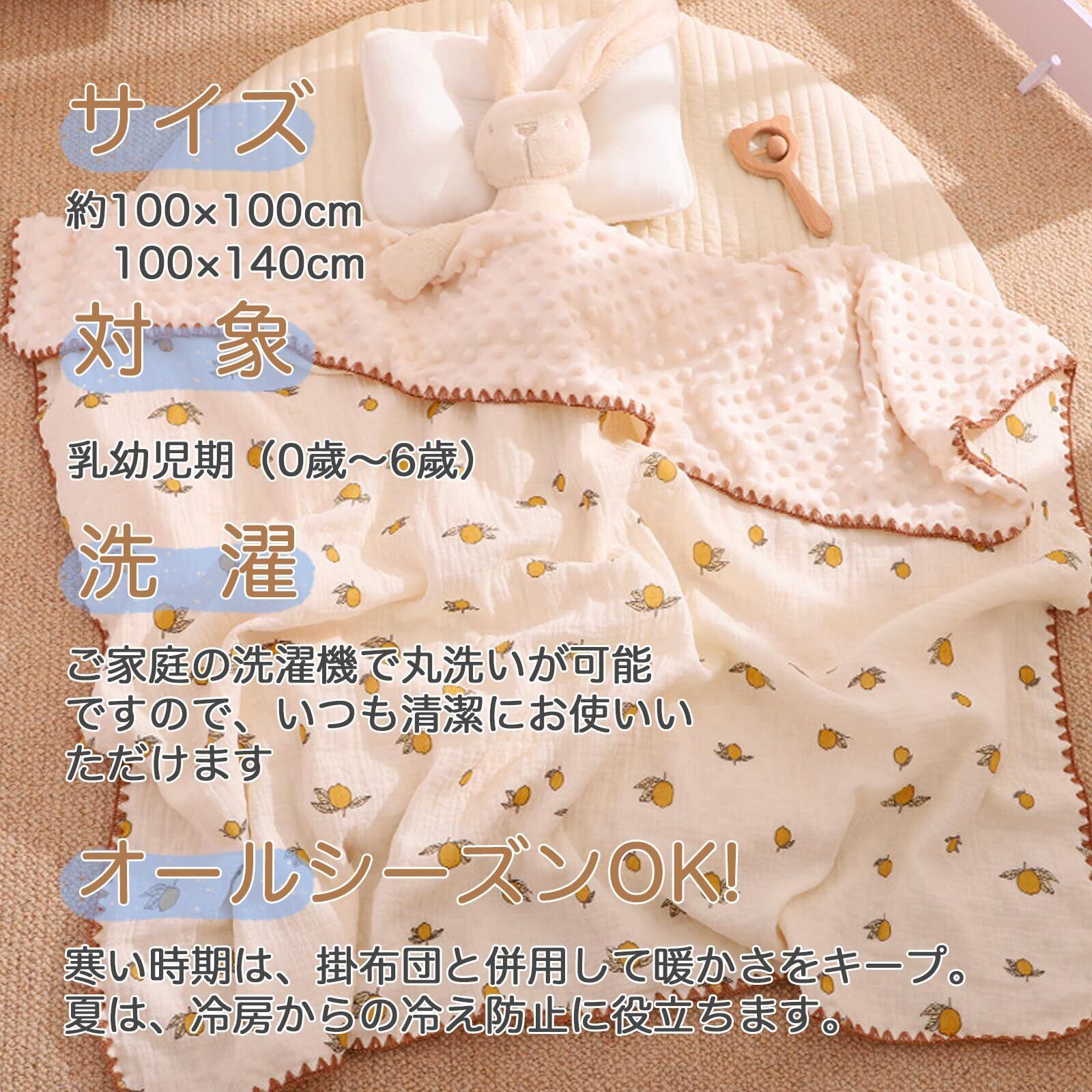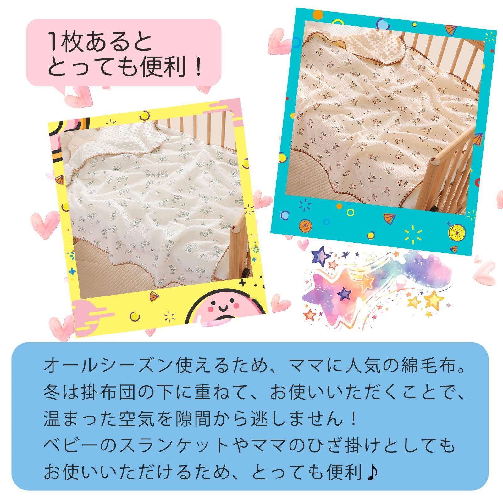 【上質な素材】暖かくて肌触りがよく、肌にやさしいインテリアデザイン。100%マイクロファイバー製のこのベビーブランケットは2層構造で、裏面には赤ちゃんのデリケートな肌に配慮したドット柄が施されています。 【両面デザイン】色々な使い方ができる、ガーゼ生地と毛布生地で気温によって掛けるのを変えれる。ガーゼ・通気性良い、乾燥しやすい、スーパーソフト。モコモコした優しい肌あたりで、汗をかいてもペッタリ肌に密着せず蒸れません。毛布素材の中でも上質なフランネル生地を採用しているので、肌ざわりはなめらかでふわふわずっと触っていたくなるような、気持ちよさにこだわりました。 【敏感な赤ちゃんの肌に綿100%のやさしさを】この綿毛布は、お肌に直接ふれる毛羽部分が綿100%。お肌が敏感で汗かきな赤ちゃんには、お肌に優しく吸水性に優れた天然素材の綿で決まりですね。シンプル好きのパパ・ママの声に応えたさりげない刺繍がおしゃれな当店限定デザイン。男の子・女の子問わないデザインだから前もって準備できるのもポイントです。 【いつでも、どこでも、オールシーズン対応】お昼寝やお出かけ時のお供はもちろん、夏場はこれ1枚で、冬場は他のお布団と併用して。状況や季節に応じていつでもかつやくしてくれるのが綿毛布の魅力。暖かい季節の1枚での使用はもちろん、冬はお布団と組み合わせても暖か。保育園のお昼寝用にもお使いいただけます。 【寝汗をかきにくいので秋冬におすすめ】表面にはふわふわとした肌触りが心地よいフランネル生地を使用し、裏面には保温性や通気性に優れたガーゼ生地を使用しています。そのため寝ているときに汗をかいてもガーゼ生地がしっかり吸収し、体が冷えるのを防ぎます。フランネル生地には速乾性に優れたポリエステルを使用し、冬場の寒い時期でも乾きやすいようにしました。
