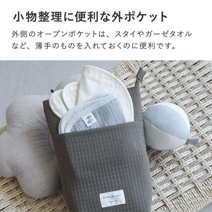 【小物整理に便利な外ポケット】 外側のオープンポケットは、マチがなくすっきり。スタイやガーゼタオルなど、薄手のものを入れておくのに便利です。