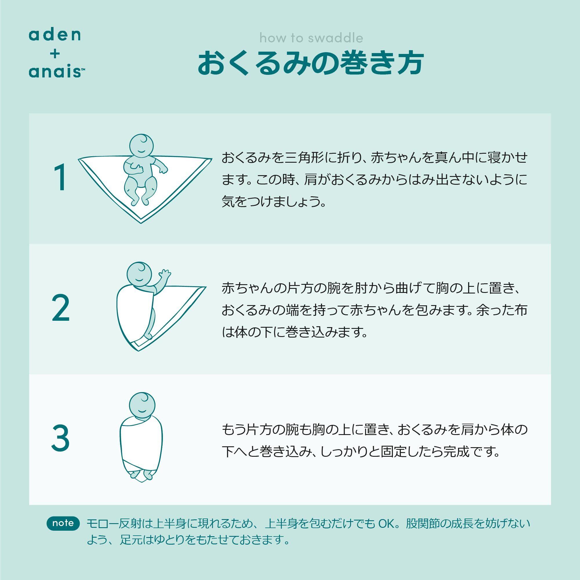 aden + anais(エイデンアンドアネイ)を代表するコットンモスリン素材で作られたディズニーベビーコレクションのスワドル。愛らしいディズニーキャラクターたちがデザインされています。 実用的な3枚セットで、毎日の育児に欠かせないアイテムです。 コットンモスリンは、伝統的におくるみとして愛用されてきた通気の良い素材。細やかな織りが特徴で、ムレを防ぎながら、体温調整がまだ難しい赤ちゃんを快適にサポートします。 スワドルを使って赤ちゃんを優しくしっかり包むことでモロー反射を抑え、まるでママのおなかの中にいるような安心感を与えられるといわれています。 エイデンアンドアネイのスワドルは、ダブルガーゼの柔らかさが魅力。赤ちゃんのお肌に優しく、使うたびに心地よさを実感できます。 おくるみとしてだけでなく、ベビーカーの日よけや授乳ケープ、おむつ替えシート、プレイマット、吐き戻しの汚れカバーとしても活躍します。 大判サイズなので多用途に使え、外出時もコンパクトにたたんで持ち運べる便利さが魅力です。 ■ 通気のよいコットンモスリン生地 ■ 洗濯機で簡単に洗え、いつも清潔に保てます ※タンブラー乾燥はお避けください ■ 赤ちゃんのお肌に優しいソフトな風合い ■ 多目的に使える便利な大判サイズ ■ ダブルガーゼで柔らかさが違う 何枚あっても重宝するスワドルは、赤ちゃんが大きくなった後もブランケットやタオル、ベッドシーツなどとして長く活躍します。 出産祝いにぴったりな、ブルーの専用ボックス入りでご用意しました。