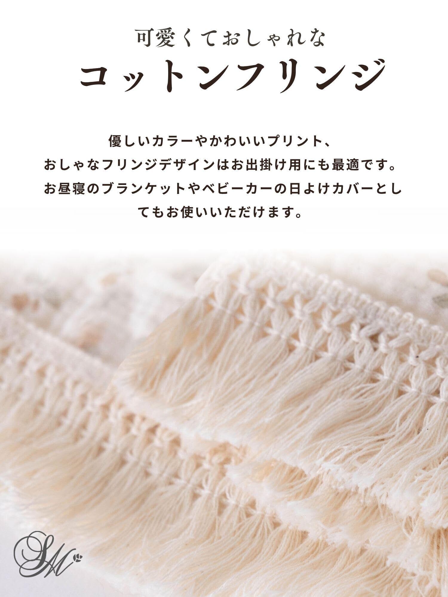 おしゃれなフリンジデザインはお出掛けの時に、ブランケットやベビーカーの日よけカバーとしてもお使いいただけます。