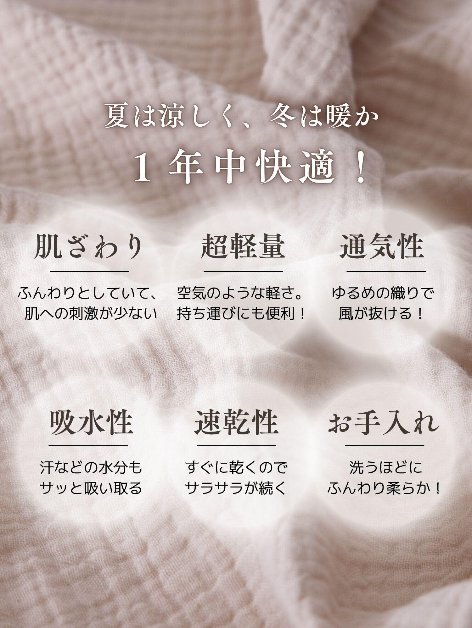 上質なダブルガーゼを贅沢に2枚重ねにしました。速乾性にも優れているのでお手入れも簡単です。