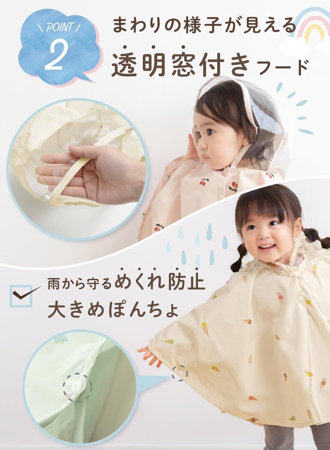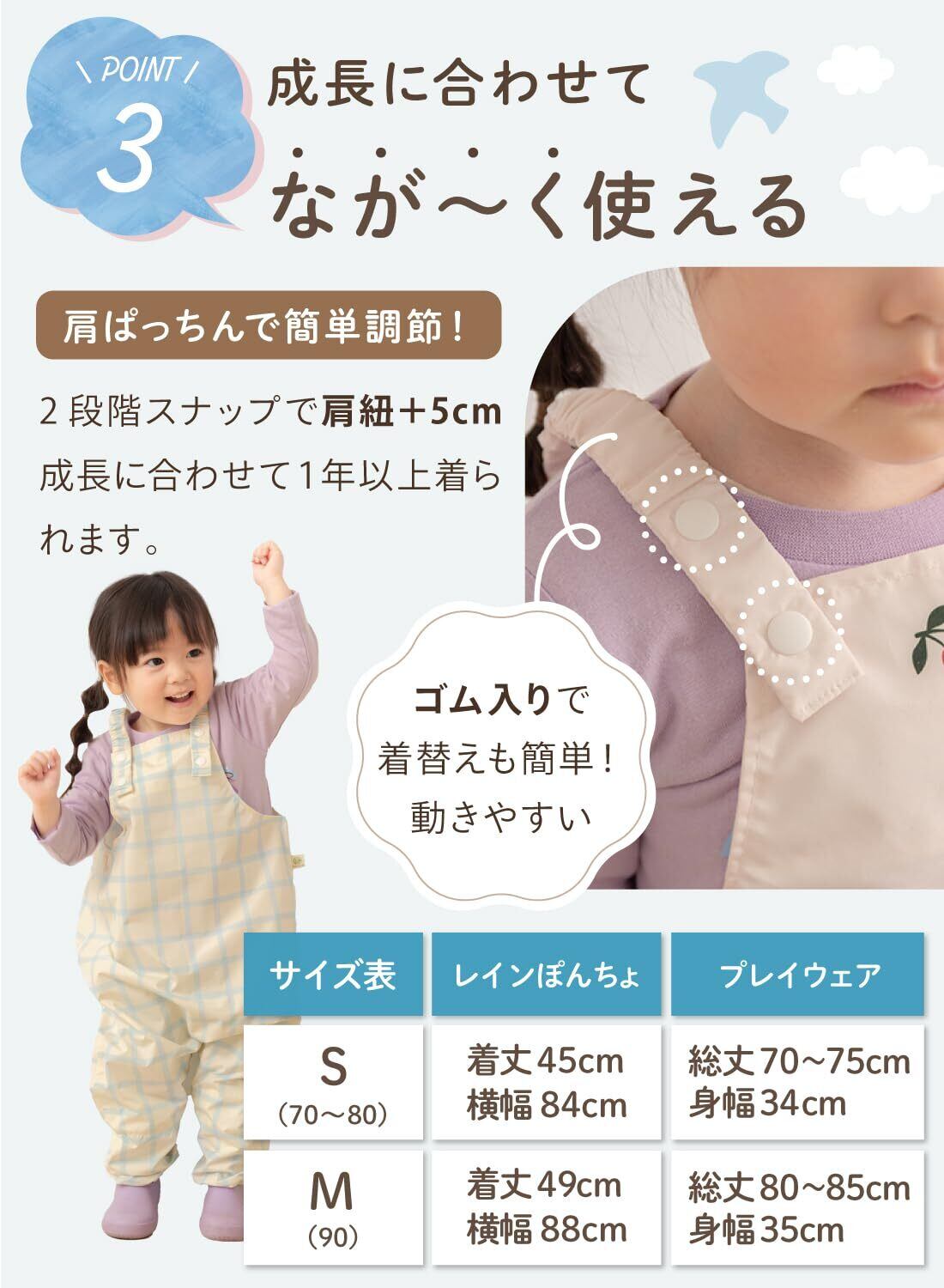 【お子さまの動きに合わせた安心設計】 レインぽんちょのフードは、お顔まわりが透明になっているので、雨の中でも周囲がよく見えます。 プレイウェアは、肩紐がゴム入りで動きやすく、2段調整ができて成長に合わせて長く着用できます。