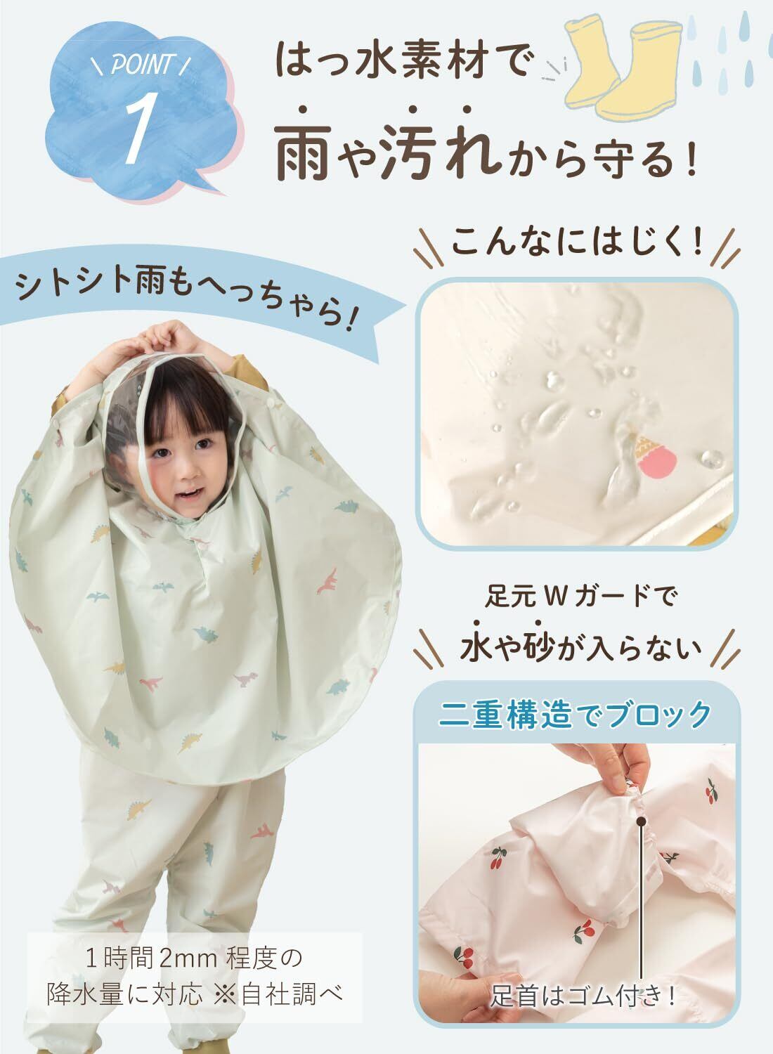 【はっ水素材で雨や汚れに強い】 汚れや雨に強いはっ水素材を採用しています。降水量1時間2ミリメートル程度の雨でご使用いただいても、内側のお洋服は濡れません 。 足元はスキーウェアのように2重に生地がかさなっていて、さらに裾にはゴム入りで、雨や砂をシャットアウト!足が濡れたり、汚れたりするのを防ぎます。