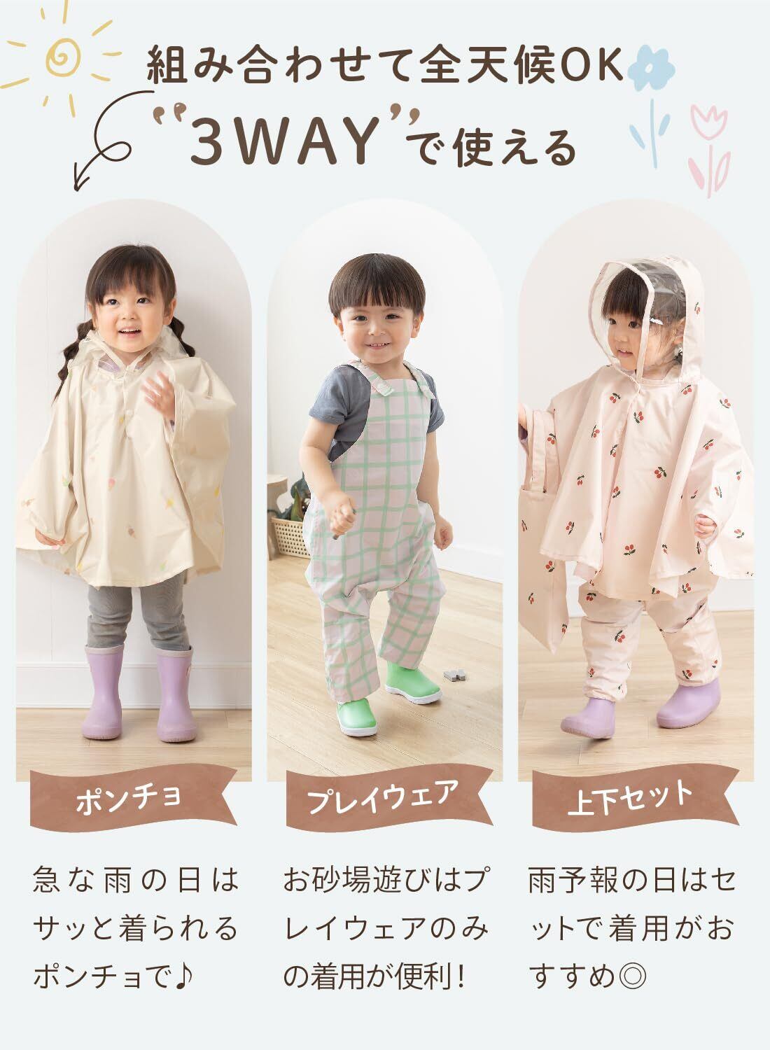 【3WAYで全天候対応】 晴れの日には、プレイウェアのみの着用が便利 お砂場着としてもご使用いただけます。 急な雨の日はサッと着られるレインぽんちょが大活躍! 雨予報の日は上下セットで着用がおすすめです。