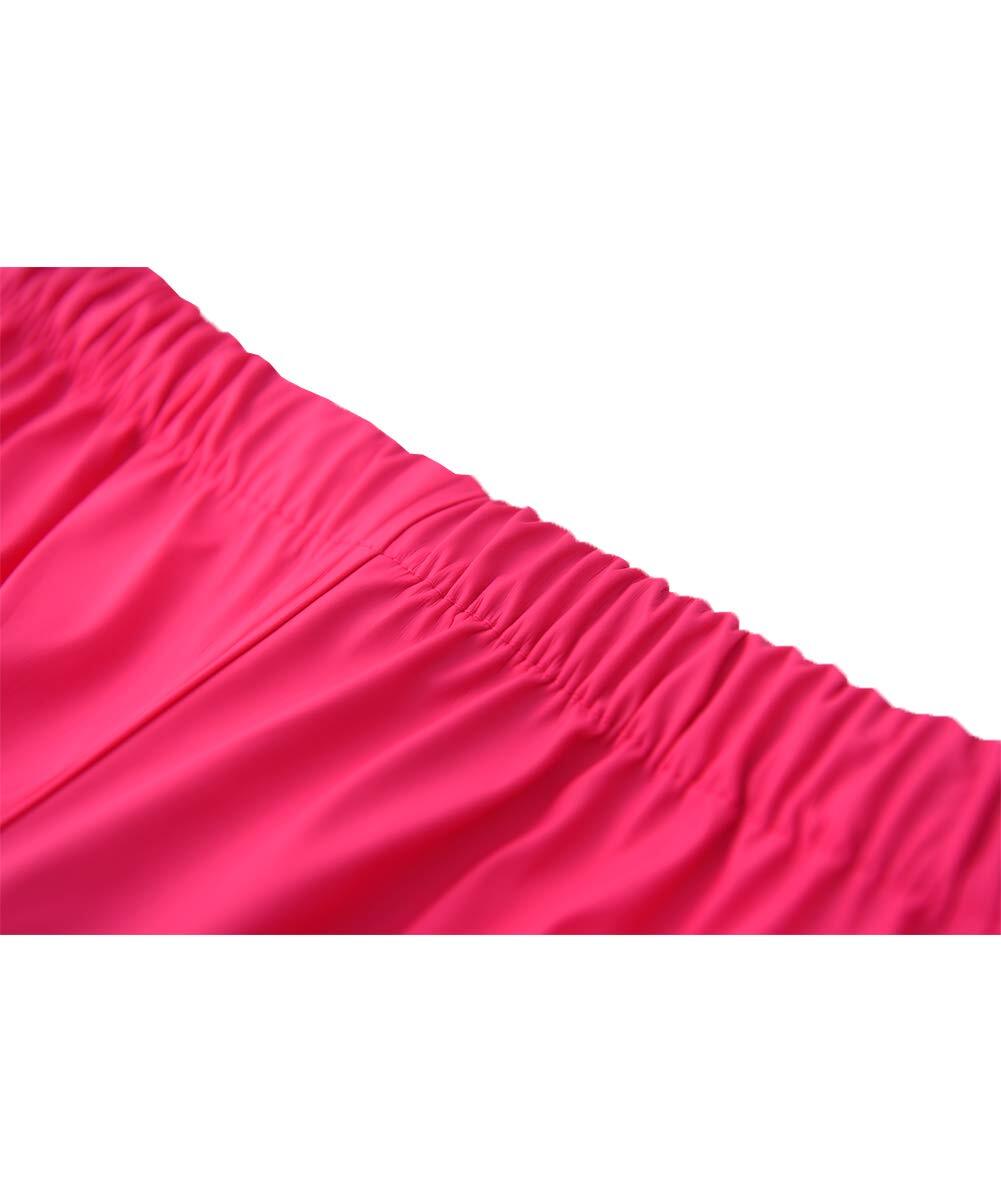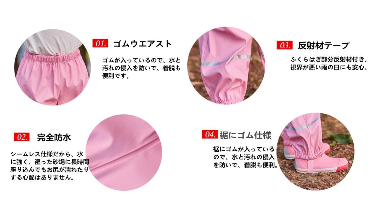 ウエストと裾にゴムが入っているので、水と汚れの侵入を防いで、着脱も便利です。ふくらはぎに反射材付き、視界が悪い雨の日には安心です。