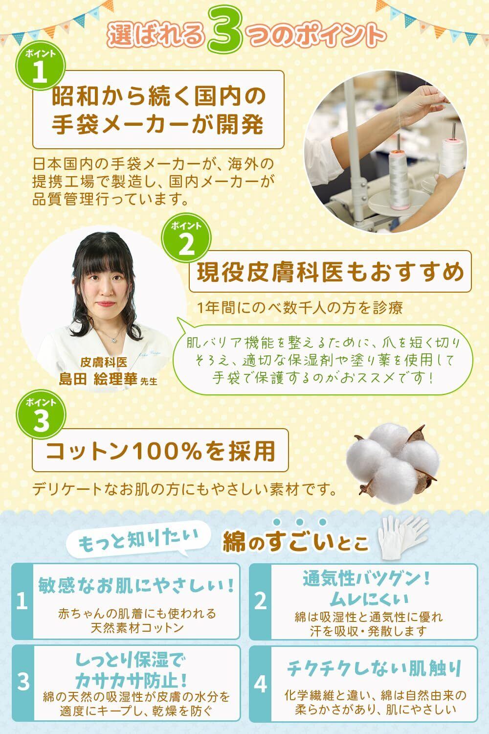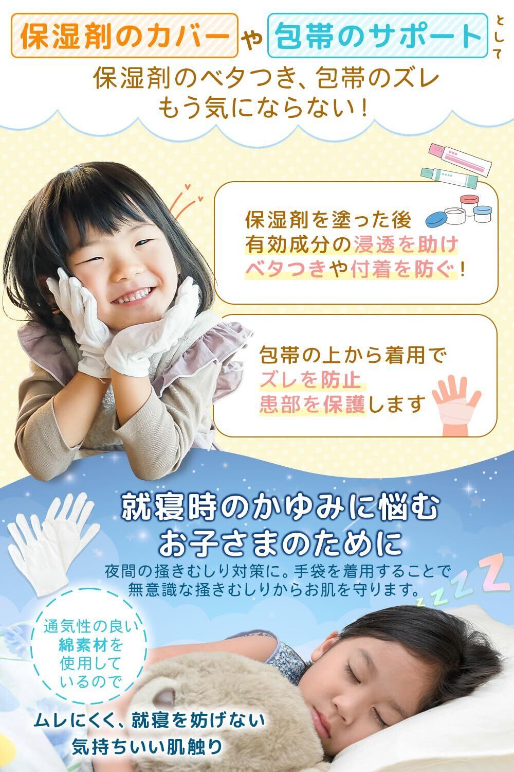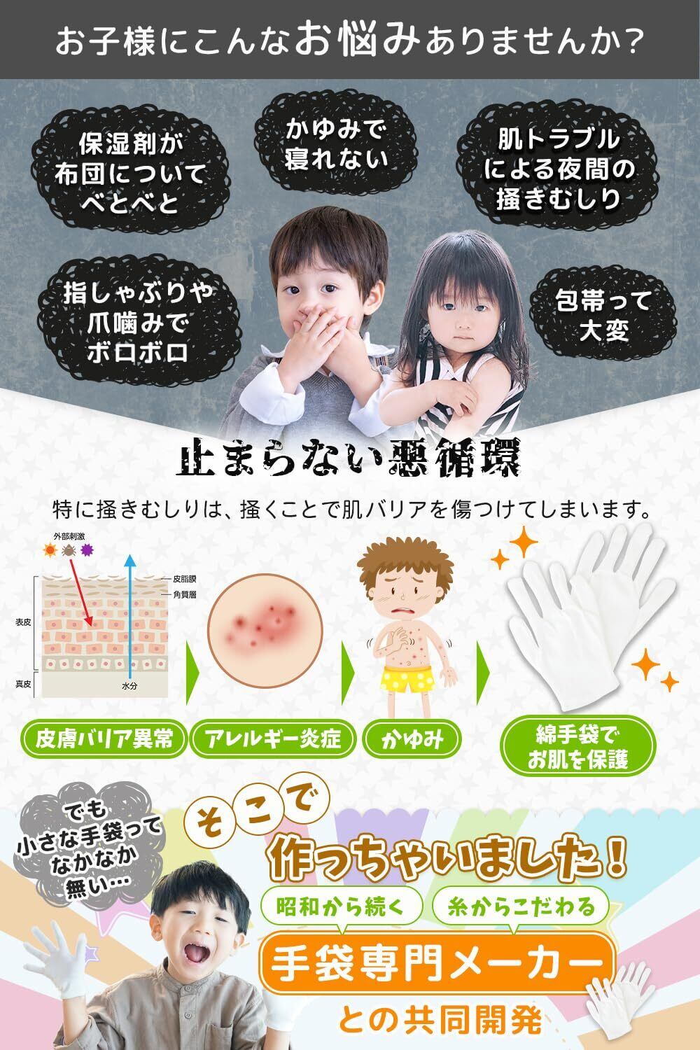 【安心と快適さを実現する幼児用綿手袋】 当社の綿手袋は、幼児の皮膚トラブルのお手伝いができるよう、綿素材の柔らかさと通気性により、お子様の手をやさしく包み込みます。掻きむしりや指しゃぶりの習慣を改善するため、お子様の指先を保護。夜間掻きむしり予防にも効果的です。健康的なお肌は、ストレスを出来るだけためない規則正しい生活、睡眠などお子様が快適に眠ることも重要です。直接肌をひっかかない対策で、肌トラブルの悪化を防ぎ、健やかな肌を手に入れましょう。