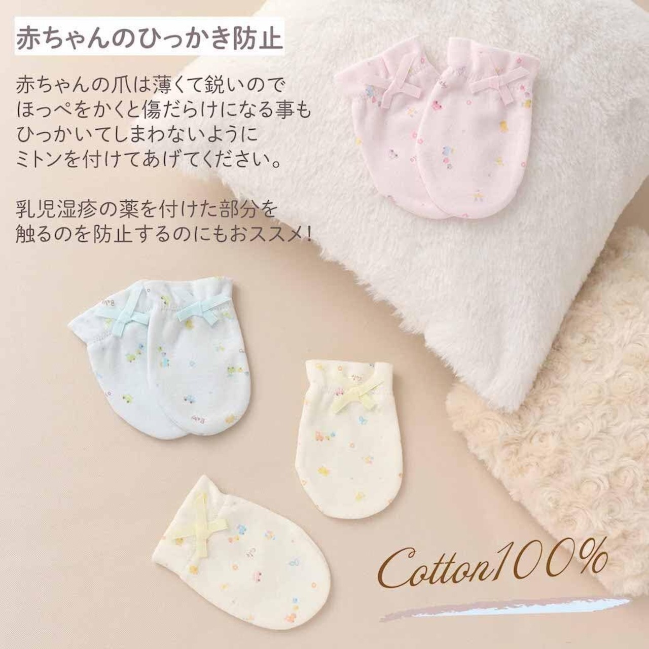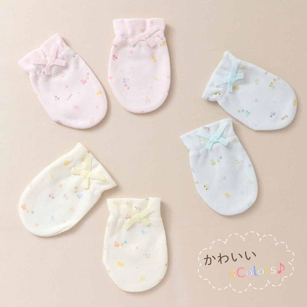 ●フリーサイズ ●カラー ピンク・ブルー・クリーム ●素材 スムース ●品質 綿100% ●日本製 ●赤ちゃんのお顔ひっかき防止に ●出産準備におすすめです。