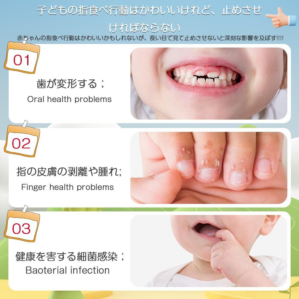 セット内容:指食い防止手袋2個セット;サイズ: M;参考年齢:15ヵ月~3歳;参考体重:18〜30kg;赤ちゃんの指食べ行動はかわいいかもしれないが、長い目で見て止めさせないと深刻な影響を及ぼす!!!!