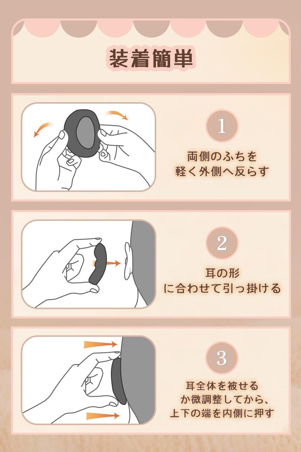 【装着簡単 自由に動ける】装着ステップ:1.両側のふちを軽く外側へ反らす 2.耳の形に合わせて引っ掛ける 3.耳たぶを含め耳全体を被せるか微調整してから、上下の端を内側に押す。特殊シートスプリングの働きにより、耳とぴったりとしたフィット感、お子様どんな激し動きでも滑り落ちない耳から外れないアクション自由のイヤーマフです。