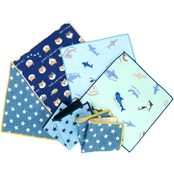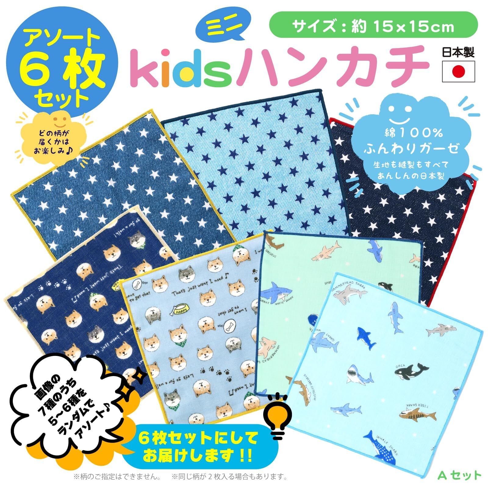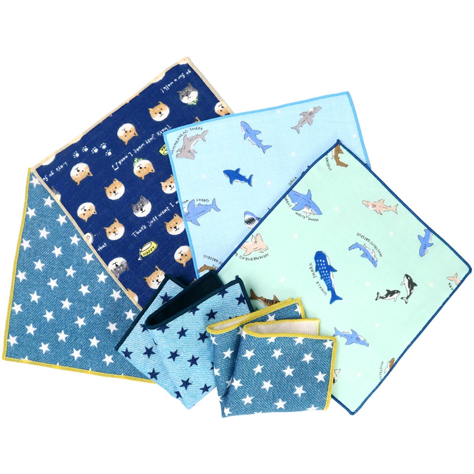 【ミニハンカチのみ6枚セット】全7種(サメ水色・サメグリーン・デニムスターネイビー・デニムスターライトブルー・デニムスターインディゴ・しば犬ネイビー・しば犬水色)の中からランダムで5〜6種をアソート6枚セットにしてお届けします。※柄のご指定はできません。同じ柄が2枚入る場合があります。あらかじめご了承ください。