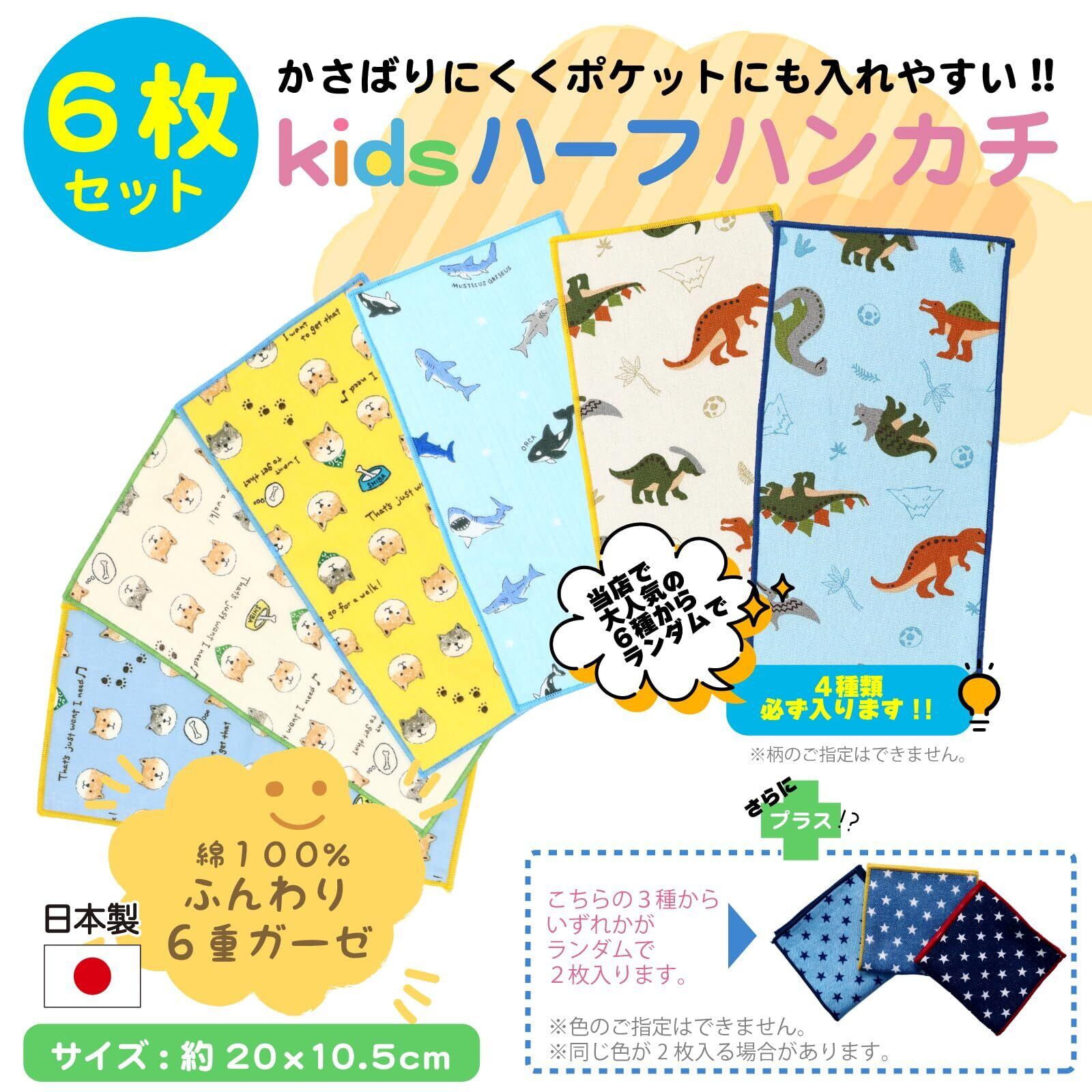 [cluster] キッズ ハーフハンカチ 6枚セット 日本製 綿100 ふんわり 6重ガーゼ 男の子 女の子 ガーゼ ハンカチ はんかち 子供 子ども こども かわいい柄 半分サイズ 幼稚園 保育園 入園 小学生 HEセット