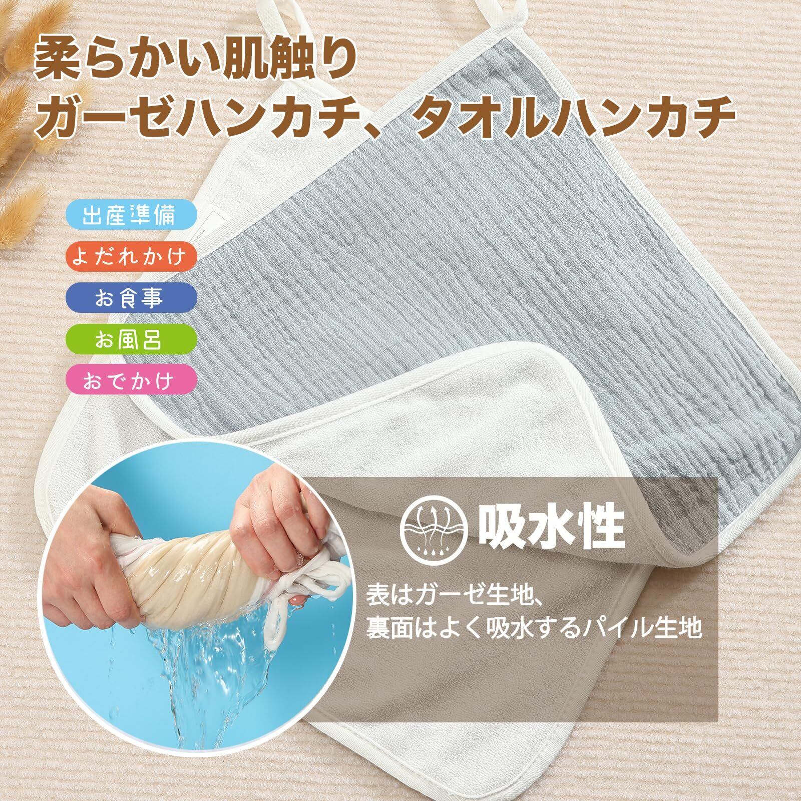 子育てが楽になるガーゼタオル。ハンカチ、赤ちゃんのガーゼタオル、よだれかけ、ベビービブとしては大活躍。特に保育園や幼稚園での使用に便利なデザインが特徴です。