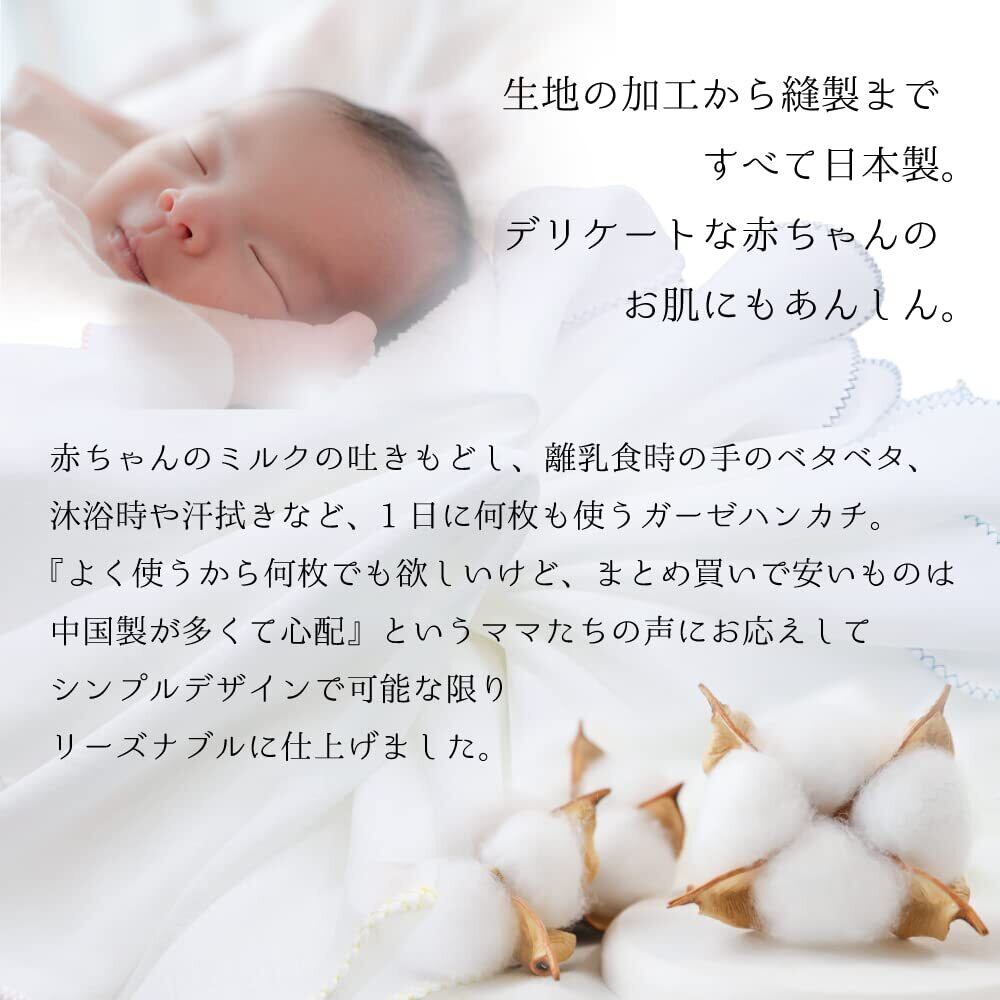 ふんわりやわらかな綿100%のガーゼ手拭い 。お肌がデリケートな赤ちゃんにもあんしんして使ってほしいから、生地の加工から縫製まですべて日本製に拘りました。 ミルクの吐きもどし、離乳食時の手のベタベタ、沐浴時や汗拭きなど、1日に何枚も使うガーゼハンカチ 。 『よく使うから何枚でもほしいけど、まとめ買いで安いものは中国製が多くて心配』というママたちの声にお応えして、シンプルなデザインで可能な限りリーズナブルに!ふちどりはメロー縫製で丁寧に仕上げました。